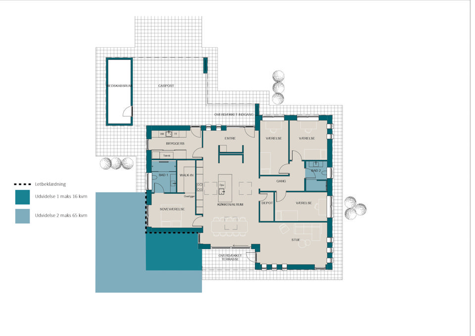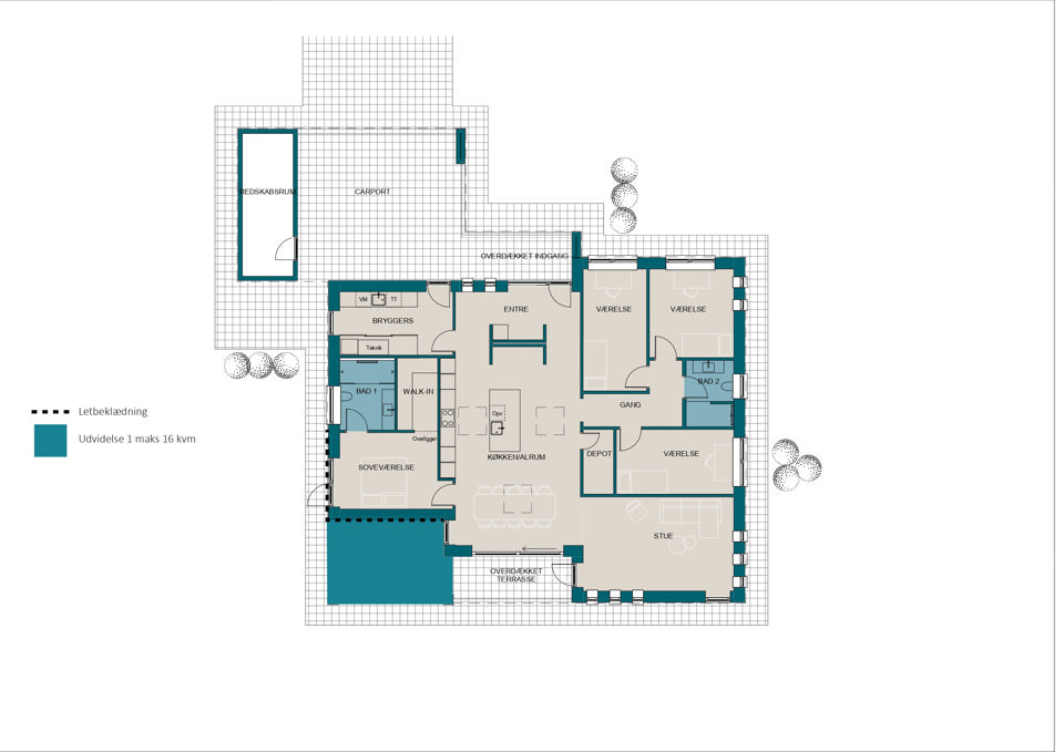 Skulle du som nybygger få behov for flere kvadratmeter senere i livet, er huset forberedt, da tagkonstruktionen går ud over beboelsesarealet. Det kan således ændres fra at have funktion som overdækning af en terrasse til at huse en egentlig tilbygning.