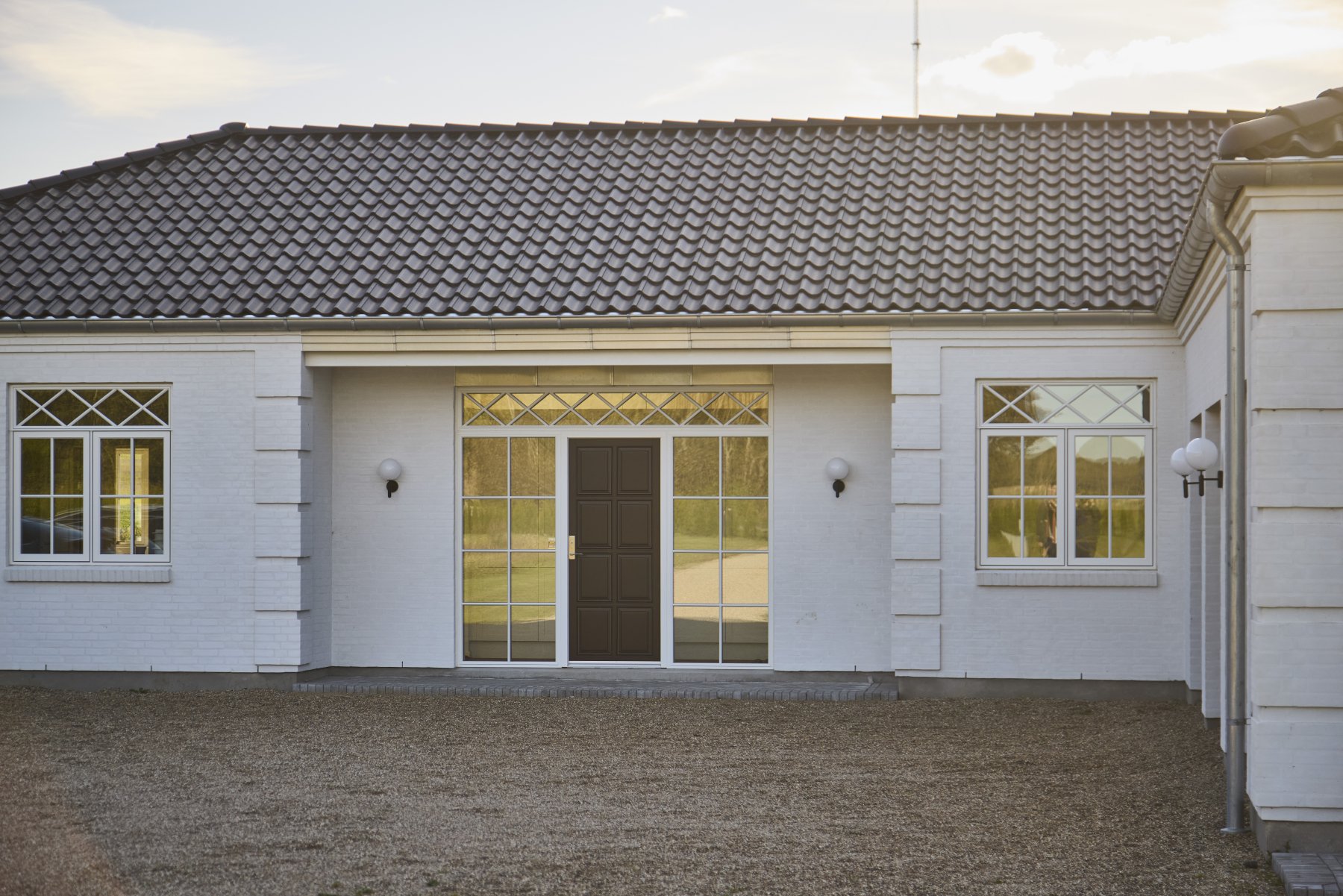 For enden af en lang indkørsel breder det store hus sig. Det er designet i en distinkt palæstil med afvalmede gavle og hvidfiltsede facader, forfinet med gesims og kvader på hjørnerne. De høje vinduer er med krydssprosser på overpartierne, og elegante kuglelamper sørger for belysningen.