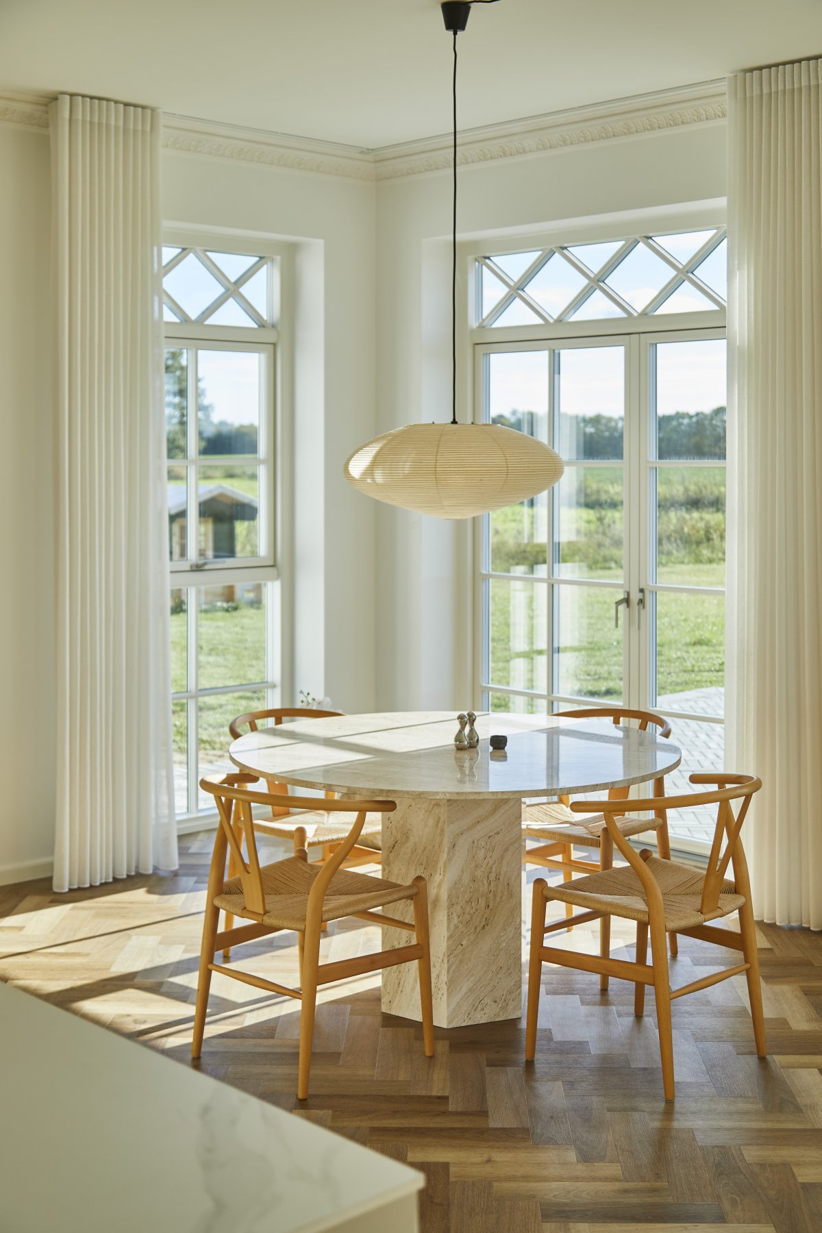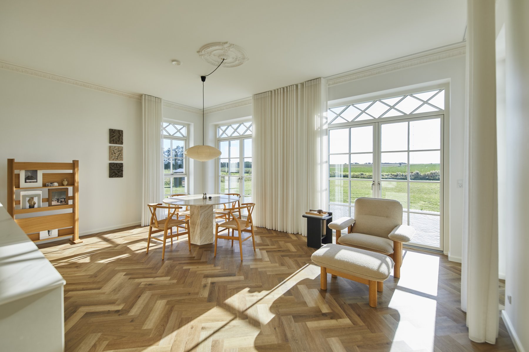 Hævede lofter og vinduespartier med overpartier giver masser af rumlighed og lys.