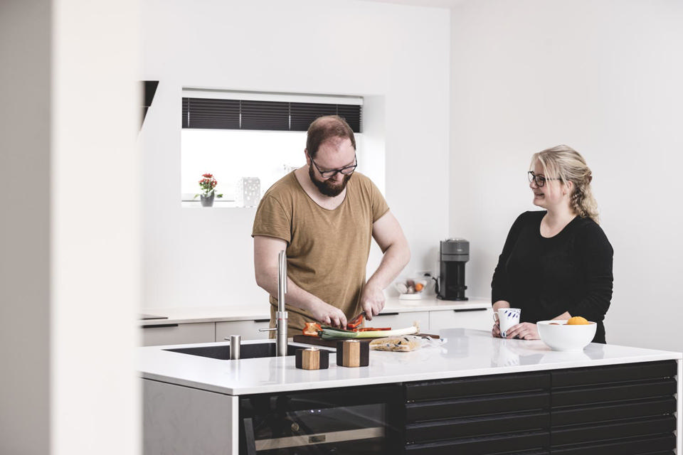 ”Ud over meget plads, ville vi også gerne have et hus med wow-effekt”, smiler Tobias, der sammen med Camilla blandt andet fremhæver store smukke marmorfliser i brusenichen, viktualierum, et køkken-alrum med højt til loftet og plads til at de begge to kan være i køkkenet – hvilket i sig selv er en luksus, når man kommer fra et lejlighedskøkken.