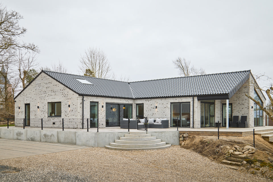 Det er nemt at forstå, hvorfor de gerne ville blive på adressen. Udsigten fejler ikke noget fra det 220 kvadratmeter store vinkelhus, der står snorlige. En nyetableret træterrasse smyger sig om boligen, der er indhegnet så parrets to hunde kan løbe frit omkring. Indenfor åbner hjemmet sig op med loft til kip, store, åbne planer og masser af lys takket være de brede vinduespartier med skrå overpartier.