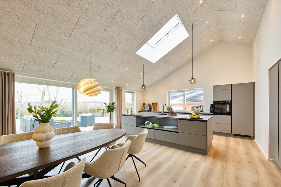 ”Vi havde dem alle sammen hjemme til jul, og det fungerede fantastisk,” siger Susanne og fremhæver de lyddæmpende akustiklofter fra Troldtekt.