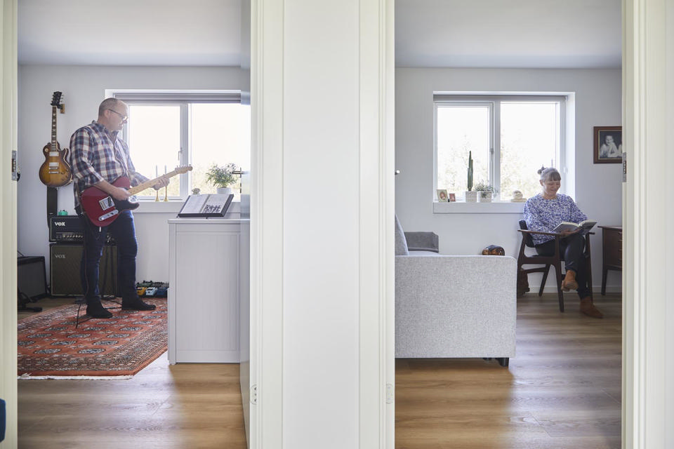 Nogle rum er indrettet som gæsteværelser med sovesofaer til børnene, når de kommer hjem fra fx København og bliver weekenden over. Et enkelt rum er indrettet til øvelokale, da Jens nyder at spille musik i fritiden. ”Og så har vi valgt at have et værelse hver, hvor vi kan have personlige ting og billeder i rammer af hver vores børn”, fortæller Lene, der også nyder, at huset har plads til mange gæster.