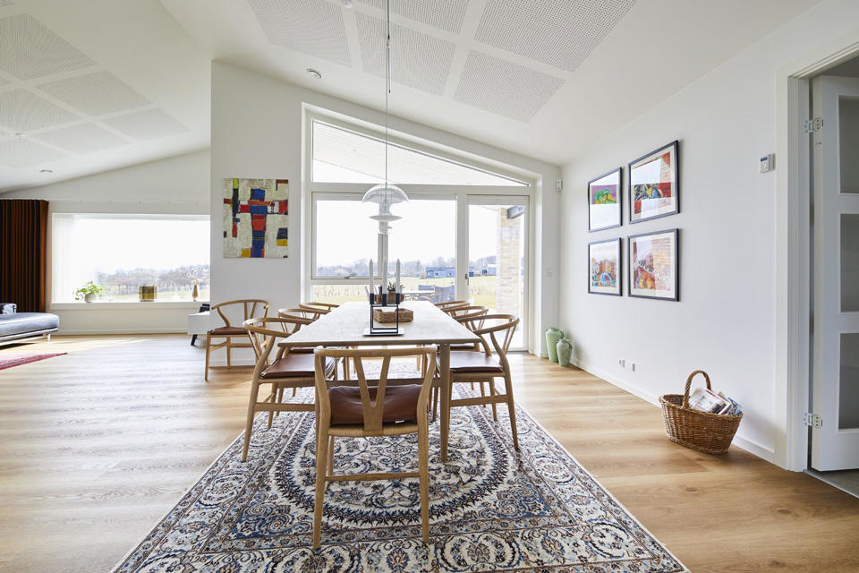 ”Da vi tegnede huset prioriterede vi et stort køkken-alrum med plads til 16 gæster til spisning, og hvis vi vinkler spisebordet med ekstra bordplader ind i stuen, kan vi have alle børn, kærester og deres børn på én gang – i alt 25 gæster til bords”, lyder det tilfreds fra Jens.