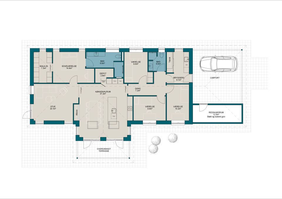 Det blev hurtigt proppet med flyverdragter, barnevogn og vasketøj. Derfor er bryggerset i parrets kommende hus opgraderet til næsten 10 kvm. Samtidig har de tilføjet detaljer som depotrum og alkove i køkken-alrummet, dobbeltbruser på badeværelset og akustiklofter i alle fællesrum, der gør hverdagen med tre børn både nem og bekvem. Der er også blevet plads til mere æstetiske valg såsom gennemgående trægulve og ovenlys.