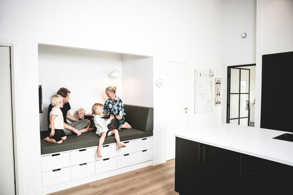 Alkover og siddenicher kan integreres i alle rum i dit nybyggeri, men vi ser dem ofte i køkken-alrummet, hvor de fungerer som en magnet for børnene. Forestil dig fx ungerne sidde og hygge sig, mens du står med madlavningen.