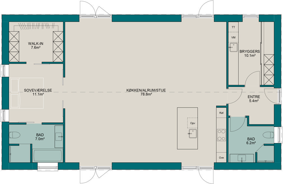 ”Huset skal først og fremmest være et hjem. Men jeg har selvfølgelig særlige materialekrav, da jeg fx skal være sikker på, at gulvbrædderne kan holde til træningen, og akustikpladerne i det store højloftede rum kan regulere lyden,” giver Steen som eksempler og fortsætter; ”Det fede har været at opleve, at jeg kan få det præcis, som jeg vil have det hos Milton Huse.” For Steen har lyset stor betydning. Huset er derfor tegnet med store vinduespartier på hver side af det store rum i midten, hvor to brede glaspartier sikrer maksimalt udbytte af solen i takt med, at den bevæger sig rundt om huset i løbet af dagen.