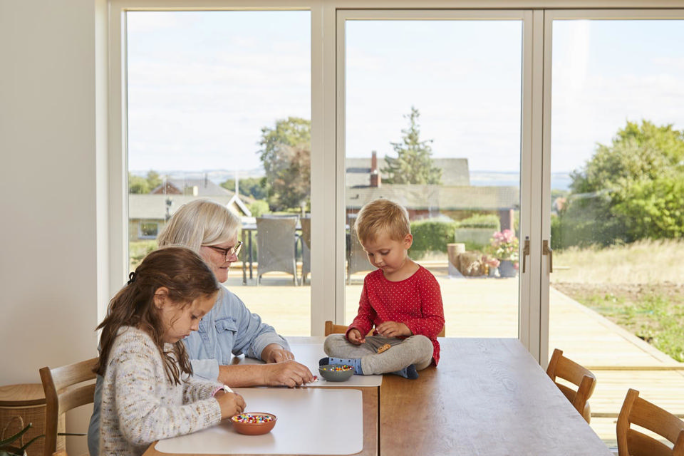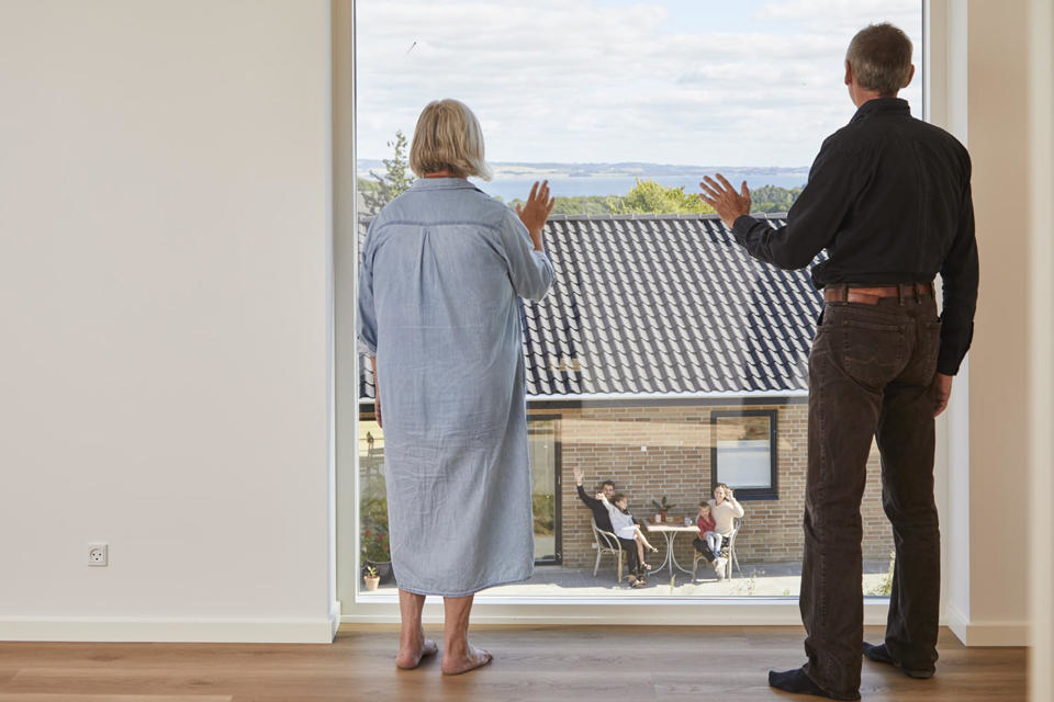 Der er vist ingen tvivl om, at de tre generationer er faldet godt til, og at løsningen med to nybyggede huse ikke kunne være bedre. ”Vi har fået det lige, som vi drømte om, men vi er også blevet godt guidet af byggerådgiveren fra Milton Huse”, fortæller Karin, der specielt i den kreative proces havde brug for sparring frem mod den helt rigtige planløsning. ”Det ene øjeblik troede Søren og jeg, at nu var den der, altså plantegningen, og to timer efter stak vi måske i en helt anden retning. Mulighederne er mange, og en erfaren byggerådgiver ved lige, hvornår han skal lytte – og hvornår han skal hjælpe med at træffe beslutninger”, fortæller Karin, der kommer fra en villa fra 1920. Parret ville gerne beholde et hus i to plan, men med en helt anden og mere praktisk indretning. ”I det nye hus har jeg fx fået et skønt hobbyrum lige ved siden af køkkenet. Det er superpraktisk, ligesom vi selvfølgelig er glade for havudsigten fra 1. sal”. Det store vindue på 1. sal er også blevet favoritspottet, hvorfra der vinkes over til Huxi og Ea.