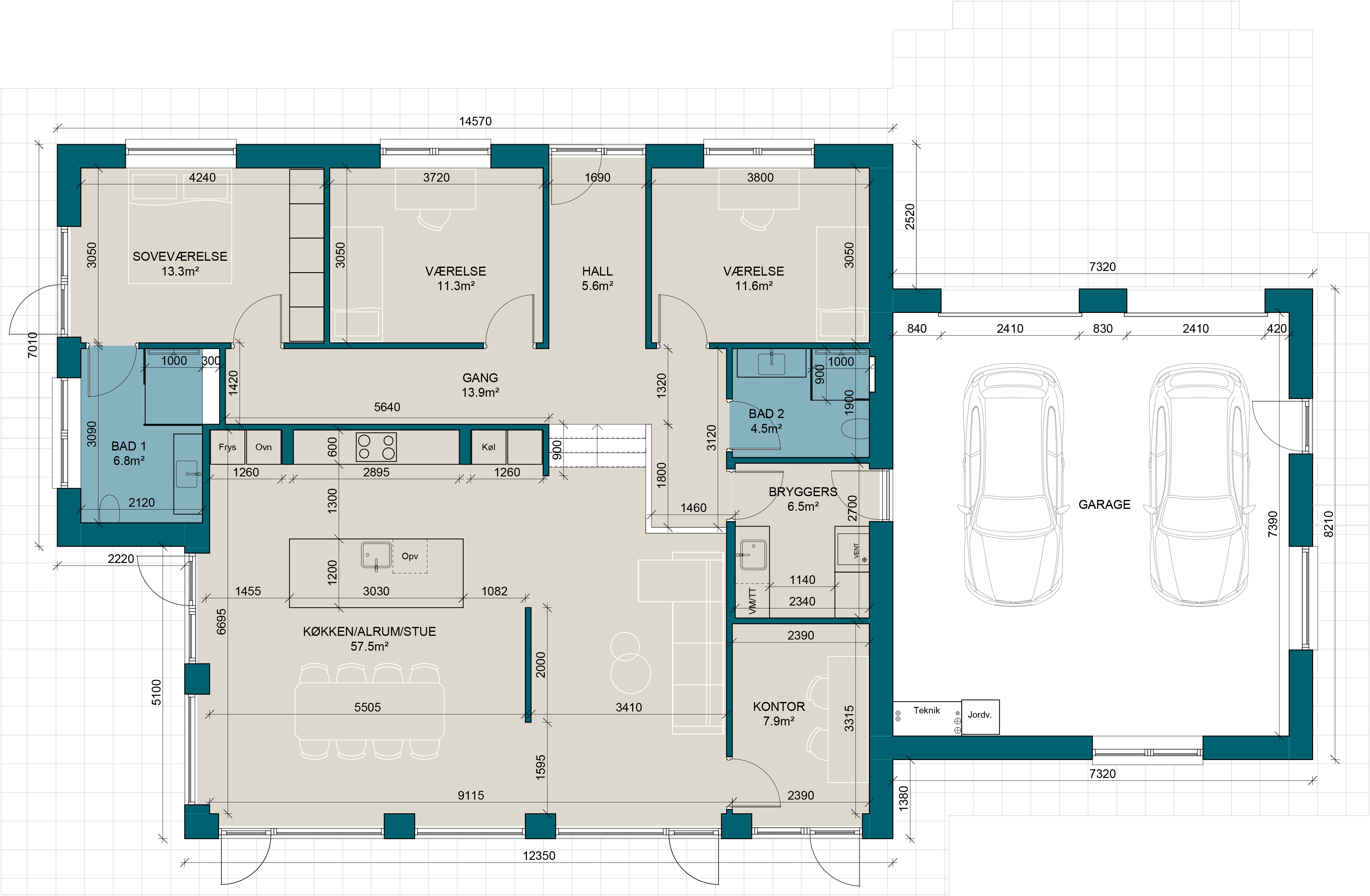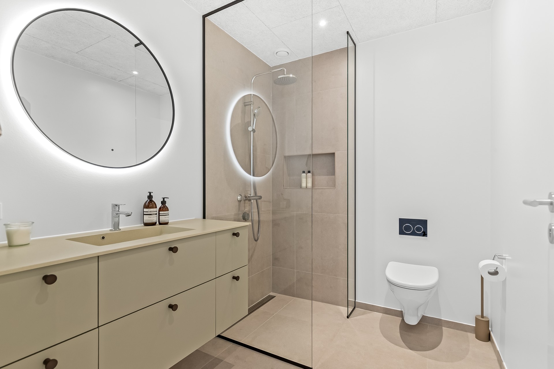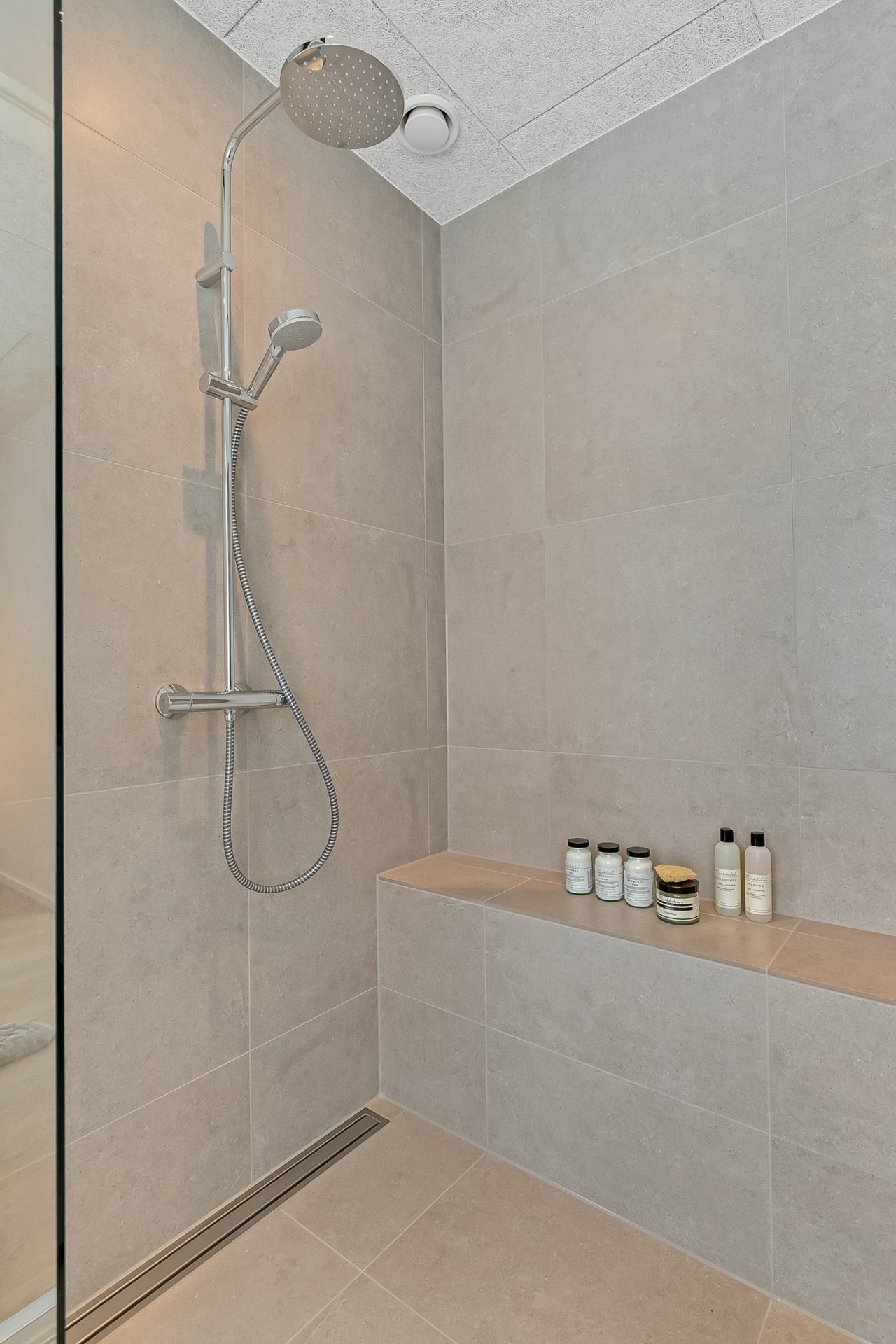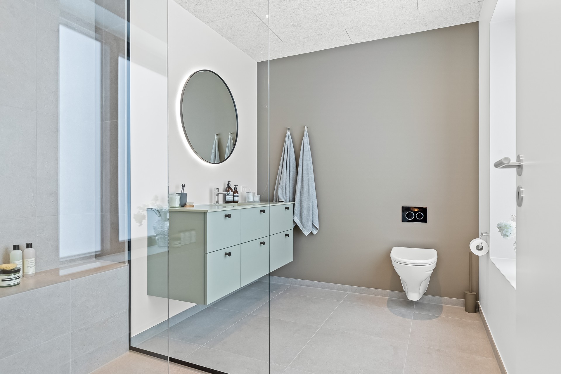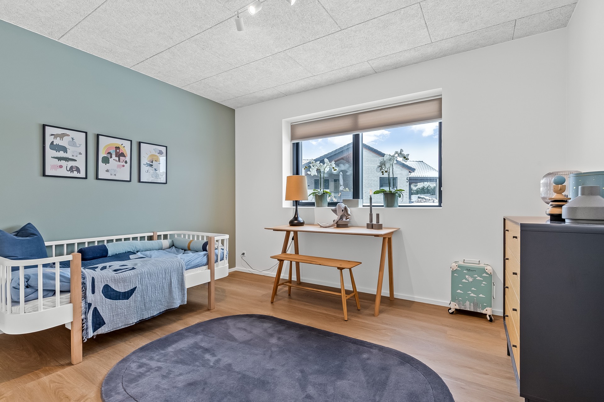 Børneværelser og forældreafdeling er samlet på husets øverste niveau. Forældreafdelingen er med eget badeværelse, hvor en praktisk bænk i brusenichen gør morgenrutinerne lidt mere komfortale. Bryggerset tilgås via den integrerede garage med epoxygulv. Men sine 51 indvendige kvadratmeter er garagen oplagt som multirum til fødselsdagsfester, hobbyer eller træningsmaskiner.