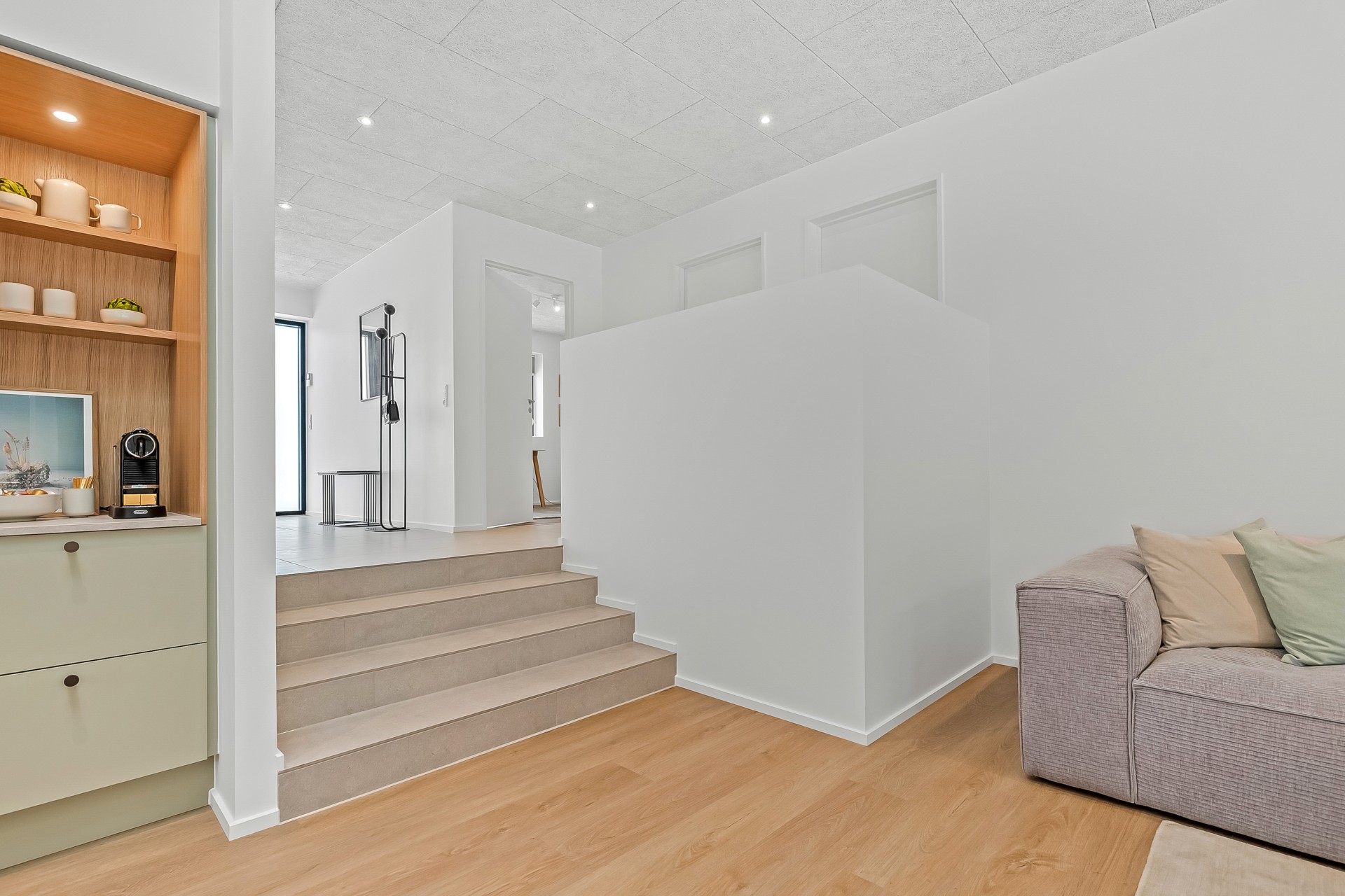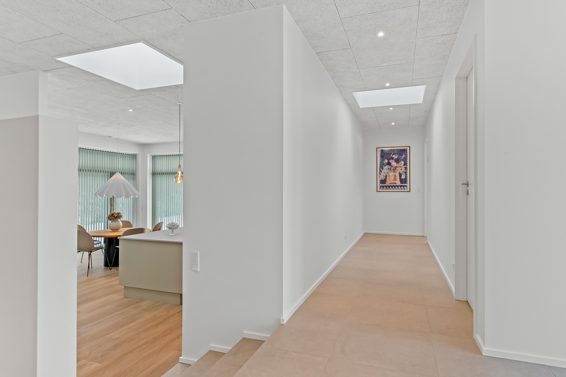 Fra entréen har du kig hele vejen ned igennem boligen. En trappe fører ned i husets leverum, hvor det forskudte terræn giver den rummet en imponerende loftshøjde på 3 meter. En halvvæg ved trappen understøtte den åbne rumfornemmelse. Det store alrum bades i dagslys fra markante vinduespartier med overpartier, der trækker solen ind i de sydvestvendte opholdsarealer. En skillevæg mellem alrum og stue skaber en naturlig zoneopdeling, så hele familien kan være sammen - også hver for sig. Fra stuen er der adgang til et lyst og lækkert kontor.