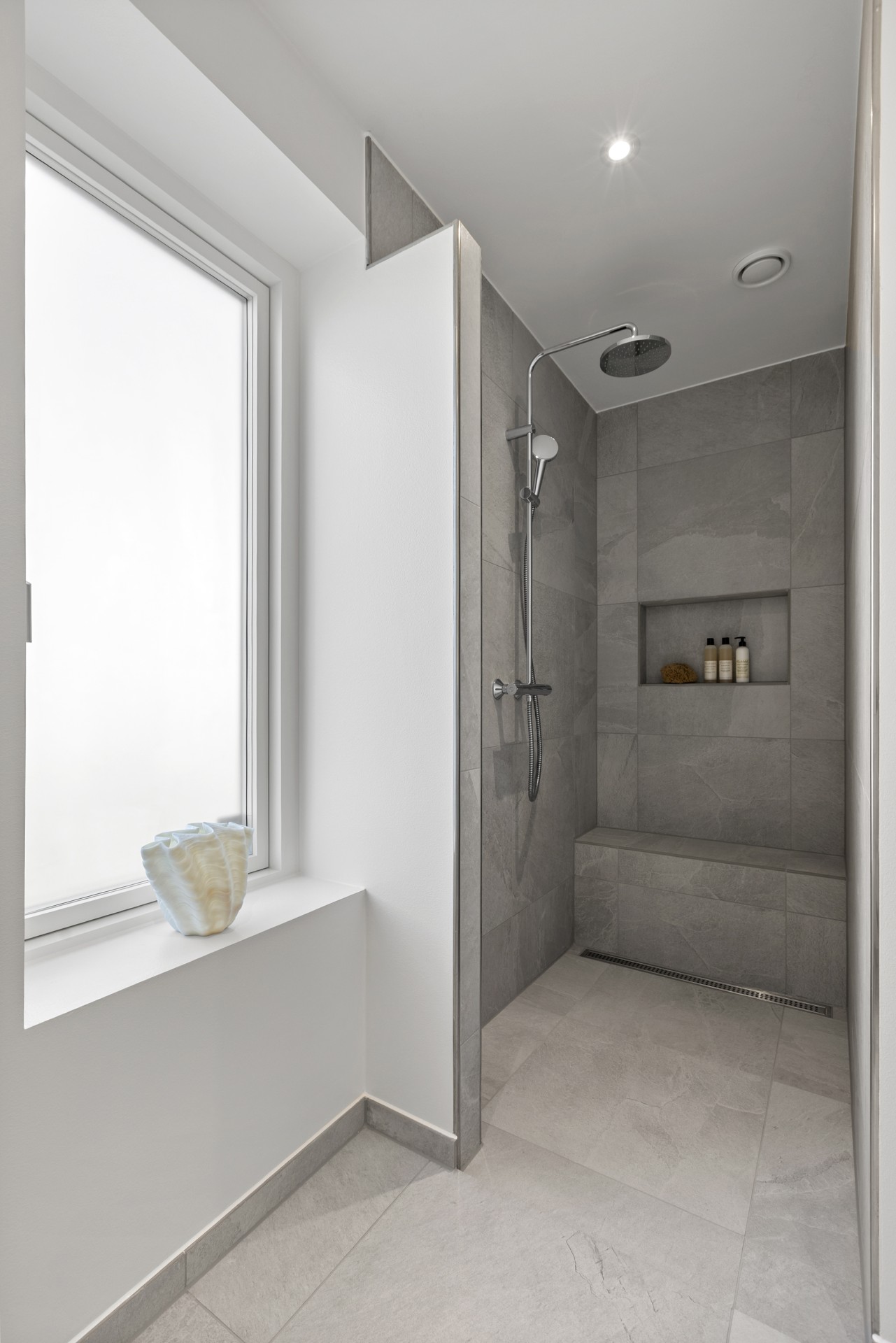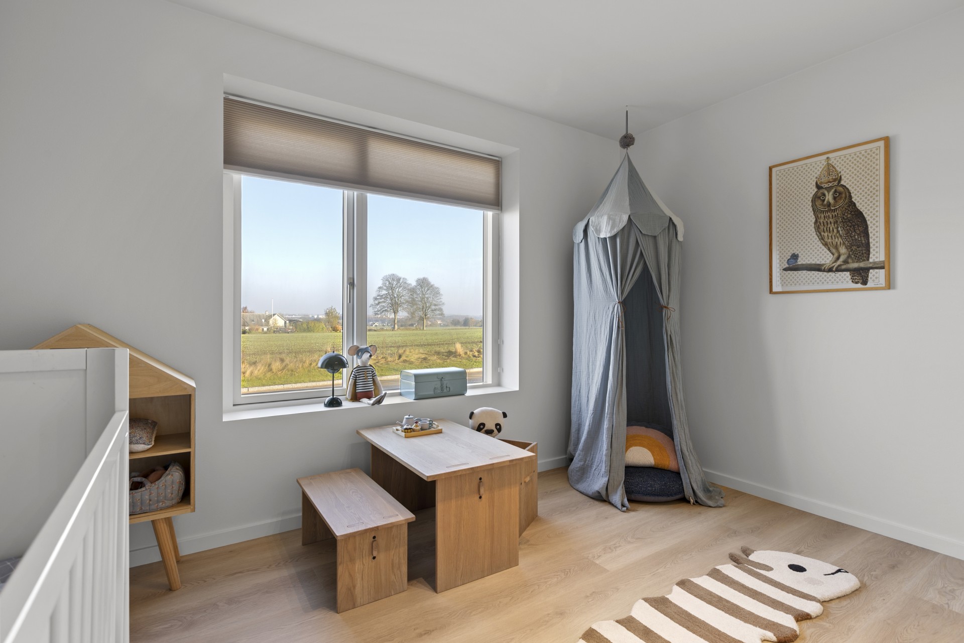 Huset er opdelt i to separate værelsesafdelinger. Forældreafdelingen i den ene ende byder på et soveværelse med indbyggede skabe, skrålofter og direkte adgang til et lækkert badeværelse med ovenlys og en stor bruseniche. Børneafdelingen i den modsatte ende af boligen består af to gode værelser samt et tilsvarende stort badeværelse - her med indbygget bænk i brusenichen for ekstra funktionalitet.