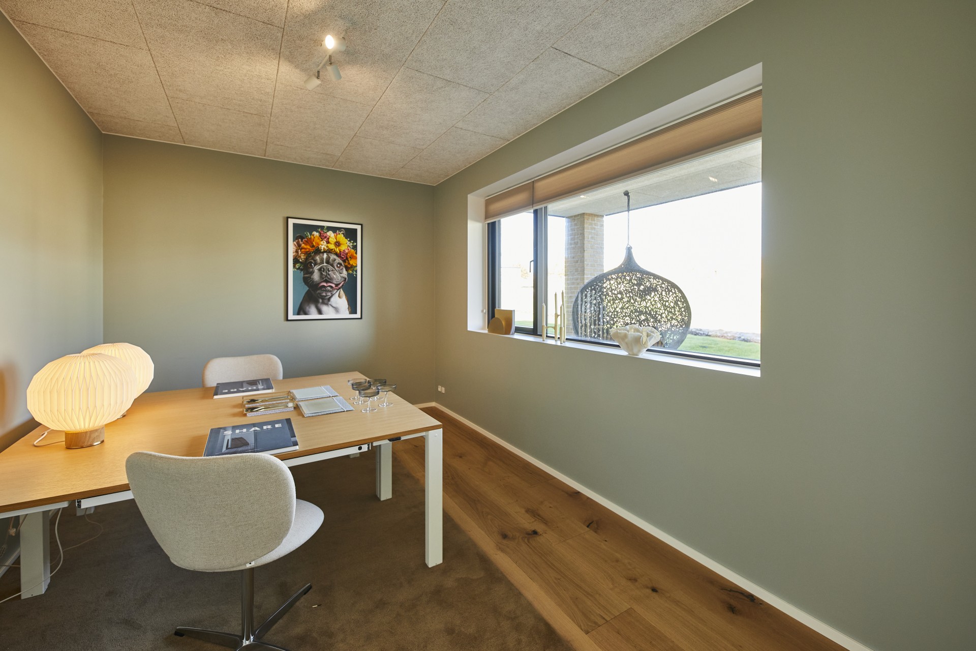 Til den hjemmearbejdende, computerspillende eller hobbydyrkende beboer er der indrettet et stort og indbydende kontor med masser af skrivebordsplads og udsigt til haven, smukt indrammet af sorte vinduer.
