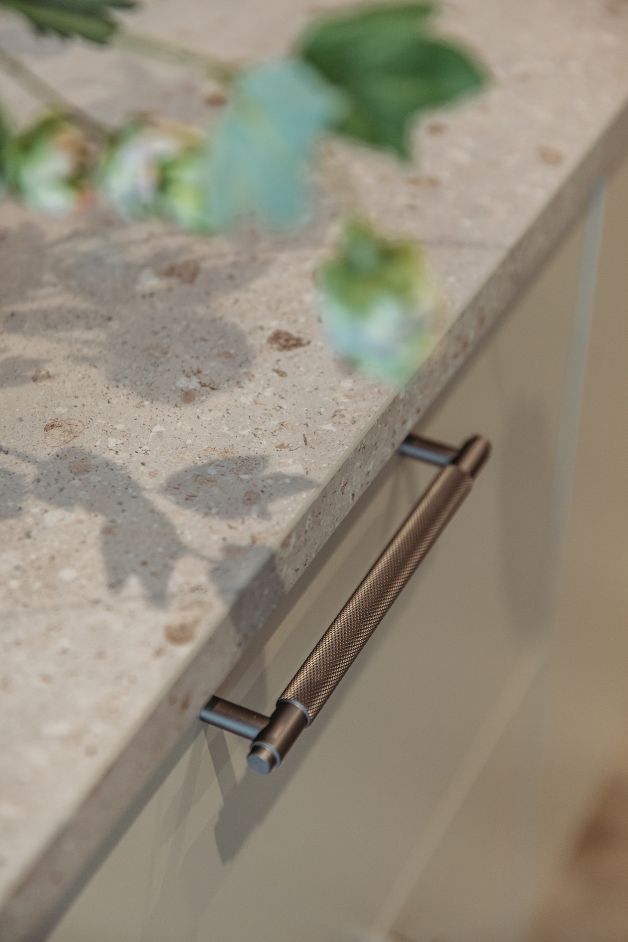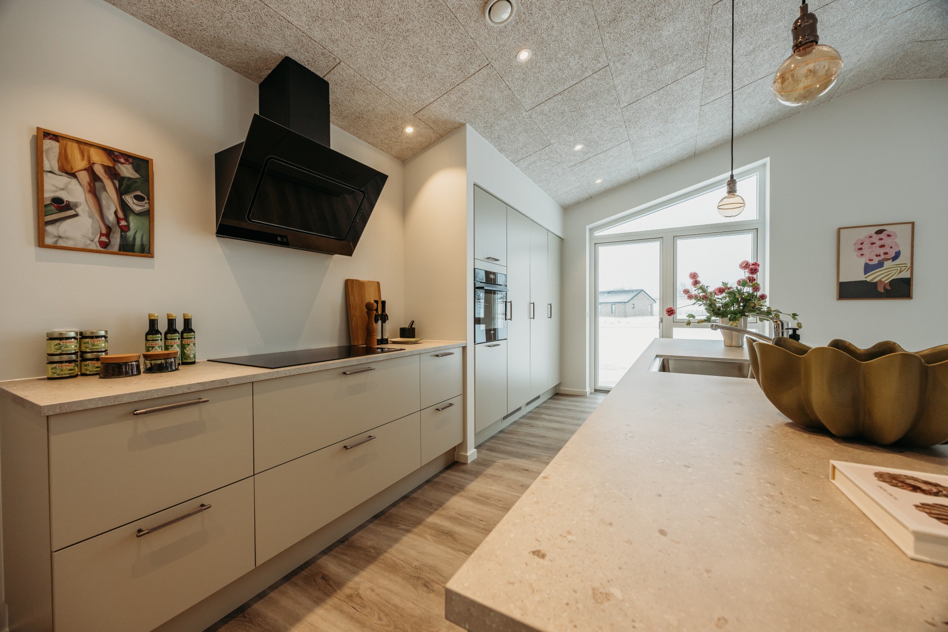 For enden af gangen ligger husets store opholdsrum. Her får du en dejlig rumfornemmelse takket være skrålofter med indbyggede spots og store vinduespartier med skrå overpartier, som sender lyset langt ind i rummet. På de mere end 40 kvm er der god plads til både madlavning, samvær og selskaber. Den indbyggede alkove giver en ekstra siddeplads, hvor du kan hygge dig med en god bog. Franske døre leder ind til stuen, hvorfra der er udgang til en sydvestvendt terrasse med masser af sol samt en stor, grøn plæne.