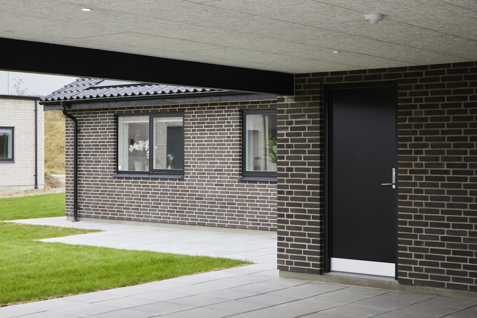 Det forskudte vinkelhus er en klassiker i det danske husbyggeri. Her er den udstyret med carport og et gedigent redskabsrum. Boligens forskudte vinkel opdeler grunden i en forhave og en mere privat baghave med to solrige terrasser mod syd og nordvest. Kombinationen af den sortbrune EW2543 Lyra mursten, de sorte vinduer og matchende tagrender giver villaen et harmonisk og nutidigt udtryk.