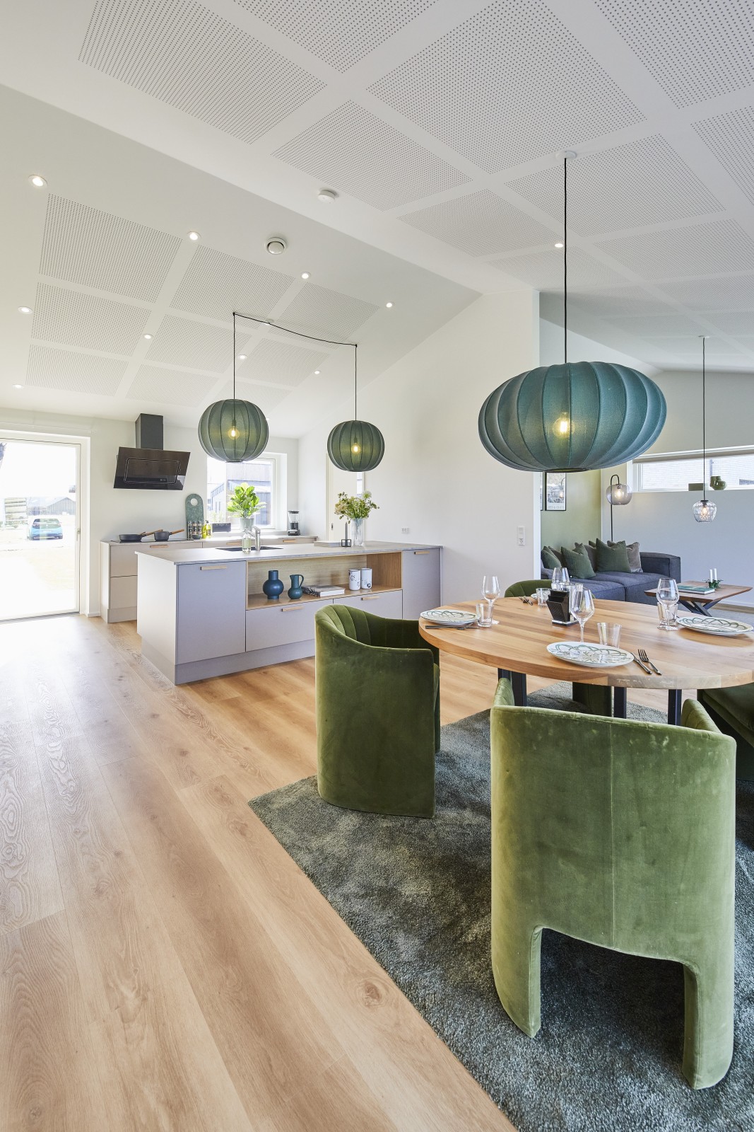Lyset vælter ind i entréen, hvor du kan tage plads på den indbyggede bænk og kigge ud i haven. Herefter åbner huset sig op i et stort multirum, inddelt i zoner af to halvvægge. Her kan hjemmets teenagere spille PlayStation sammen, der kan indrettes legeområde til de yngste – eller måske et kombineret arbejds- og lektierum. Det er et fleksibelt rum, der kan ændre funktion i takt med familiens behov.