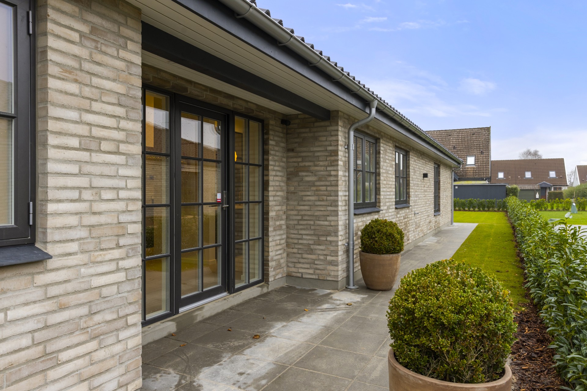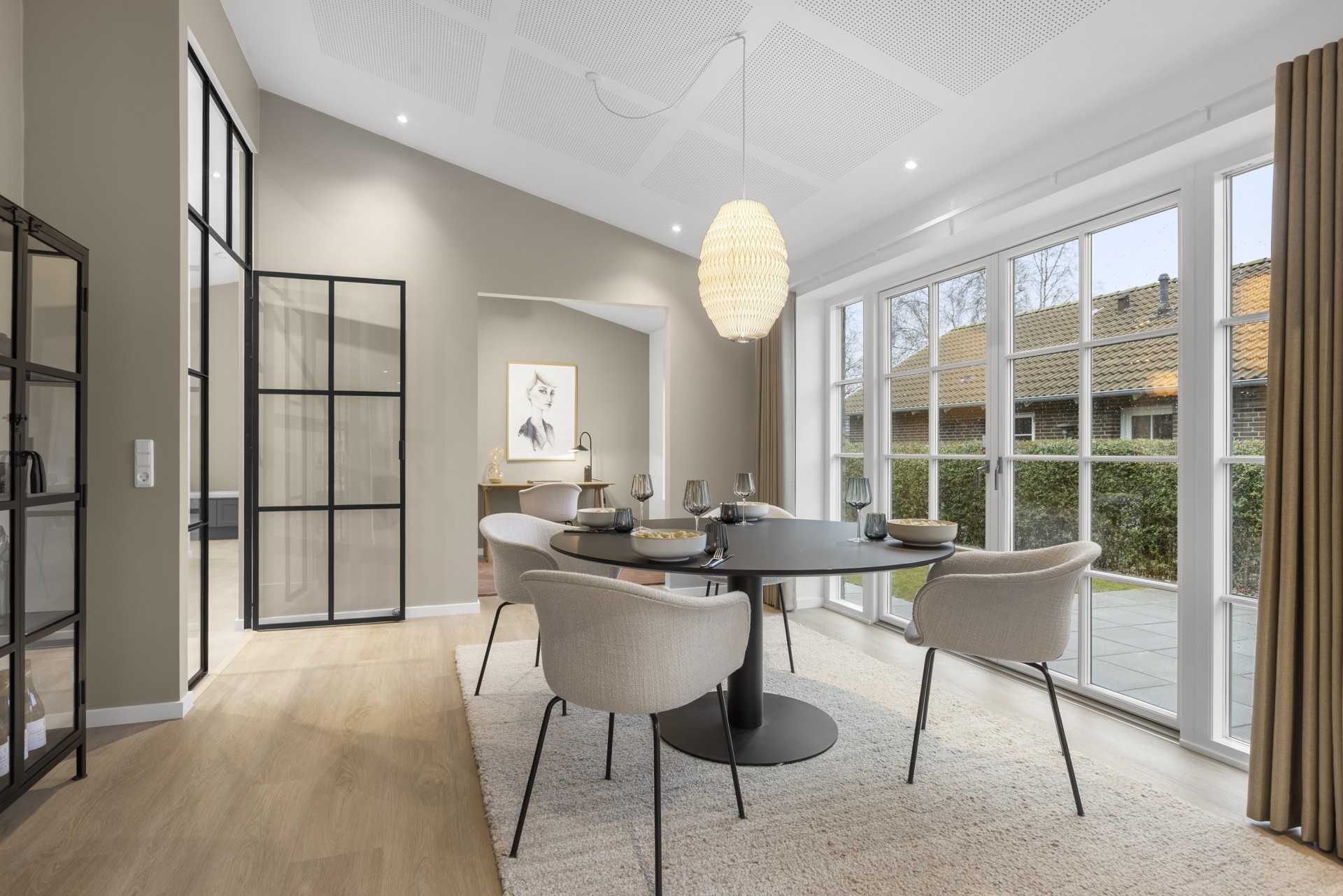 Indenfor finder man blandt andet gennemgående skrålofter, ovenlys og elegante newyorker-døre med sprossede glaspartier. Sammen med formpressede inventarlåger skaber det et både hyggeligt og nutidigt udtryk. Lysindfaldet er generøst, og rummene føles åbne og imødekommende. Vinduer med lav brystning giver masser af udsyn og lys.