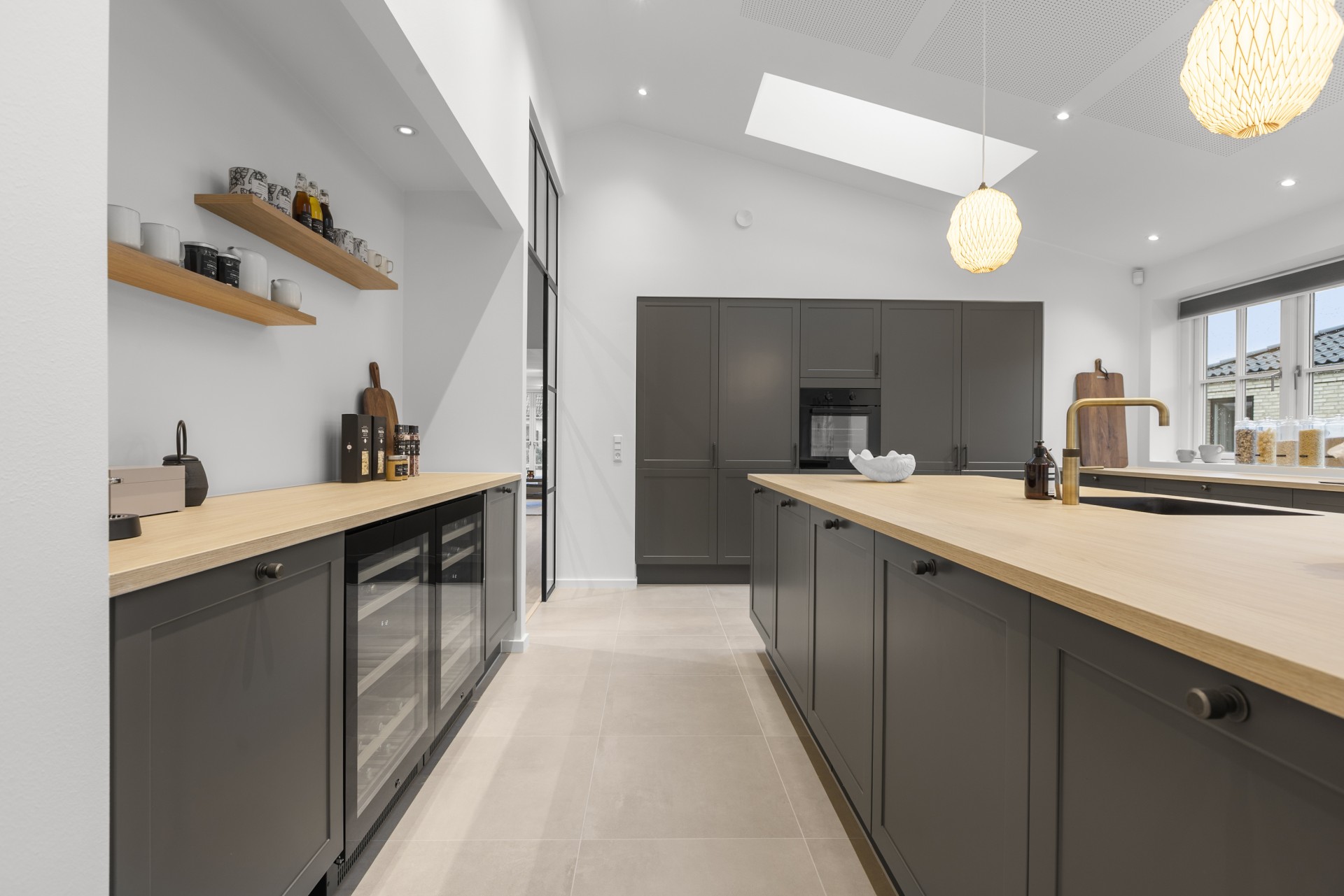 Køkkenet ligger for sig selv, hvilket er en sjælden egenskab i dag. Her er der kræset for detaljerne med skrålofter, ovenlys, god bordplads, vinkøleskab, stor køkkenø og bordemhætte. Et stort og praktisk depot med skjult indgang fuldender køkkenet, som er skabt til madglæde og fællesskab.