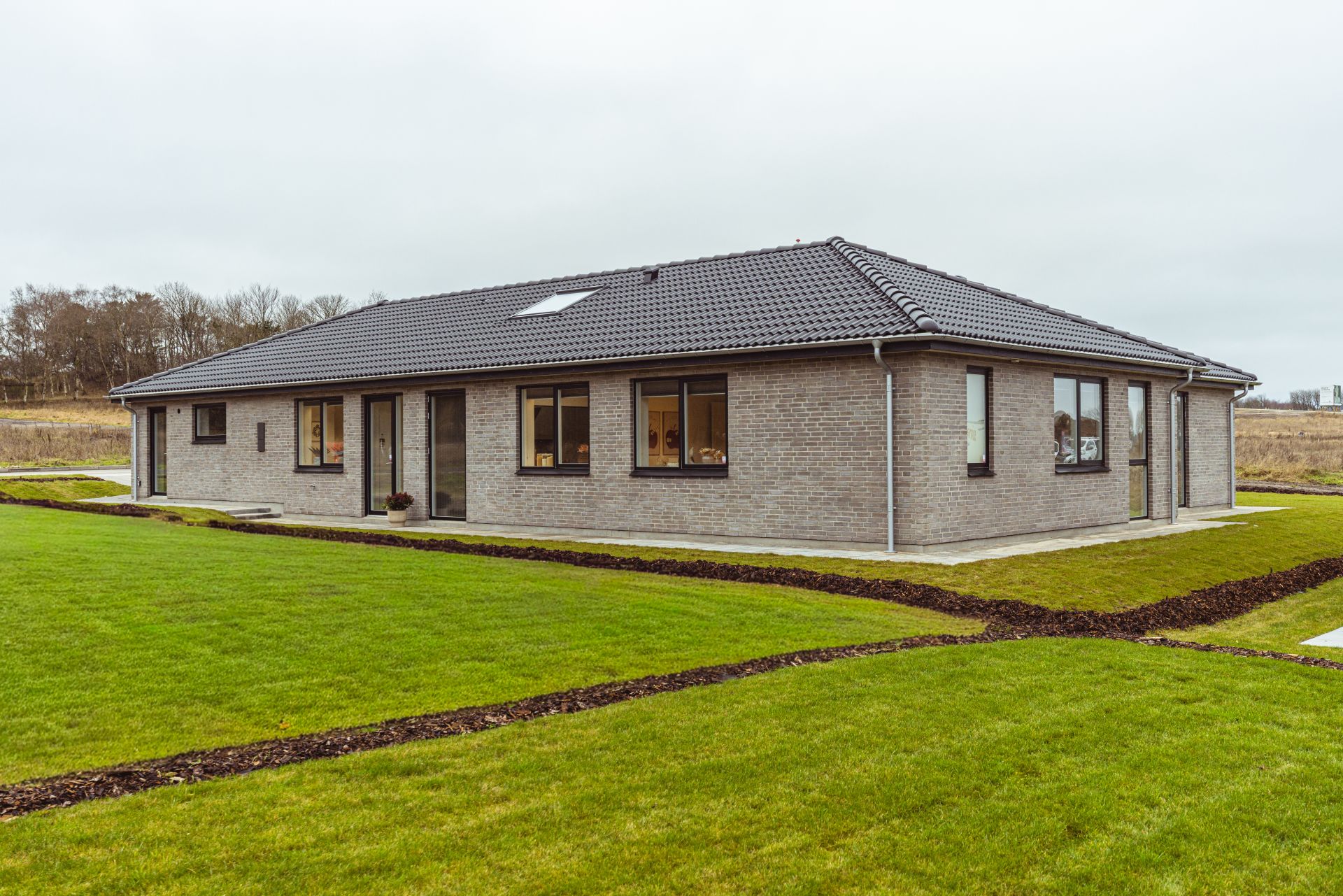 Huset har fire udgange til haven, der skaber en naturlig sammenhæng mellem inde- og udeliv. Facaden er muret i den engoberede, grå mursten RT 472 Prima Bellagio med diskret farvespil, og valmtaget er med ca. 30 cm udhæng, der beskytter mod vind, vejr og varme.