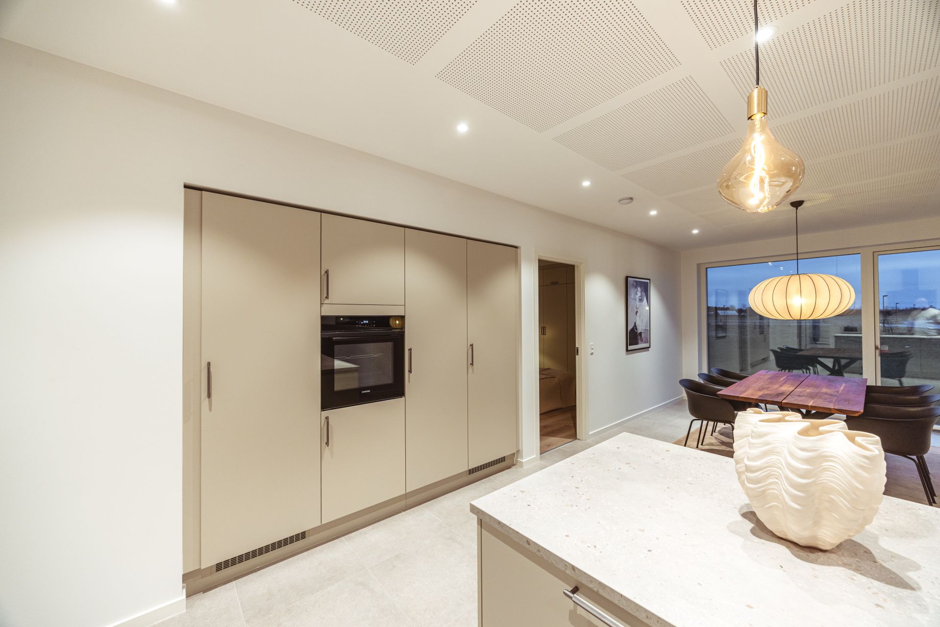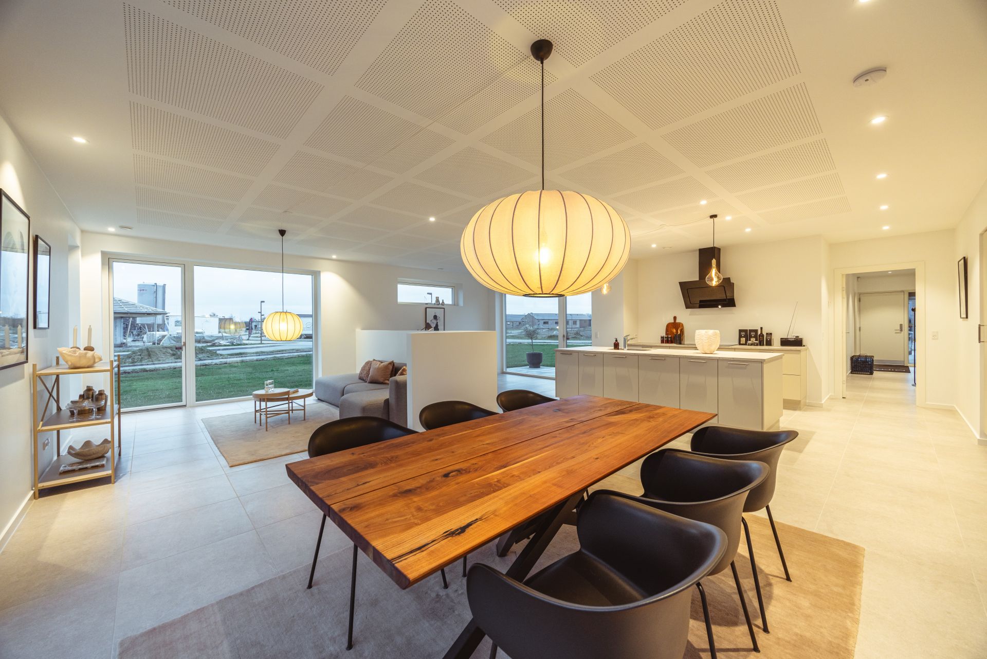 Boligen er indrettet med lyse og vedligeholdelseslette materialer hele vejen igennem, gode opbevaringsmuligheder og akustiklofter i det store opholdsrum. Der er gulvvarme i hele huset samt et ventilationssystem med varmegenvinding, som bidrager til et sundt indeklima og en lav energiregning.