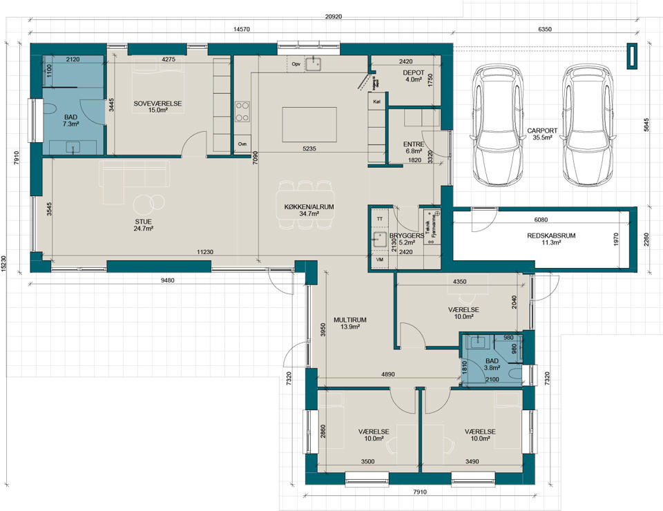 Prisen vokser med antallet af kvadratmeter, men kvadratmeterprisen kan variere alt efter valg af materialer og arkitektur. Tænk over, hvad du har brug for nu – og i fremtiden. Vi skal nok hjælpe dig med at få det maksimale ud af pladsen – nogle gange kræver store idéer færre kvadratmeter, end man skulle tro.