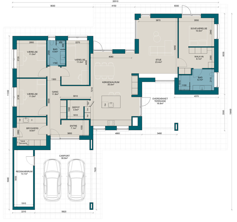 Prisen vokser med antallet af kvadratmeter, men kvadratmeterprisen kan variere alt efter valg af materialer og arkitektur. Tænk over, hvad du har brug for nu – og i fremtiden. Vi skal nok hjælpe dig med at få det maksimale ud af pladsen – nogle gange kræver store idéer færre kvadratmeter, end man skulle tro.