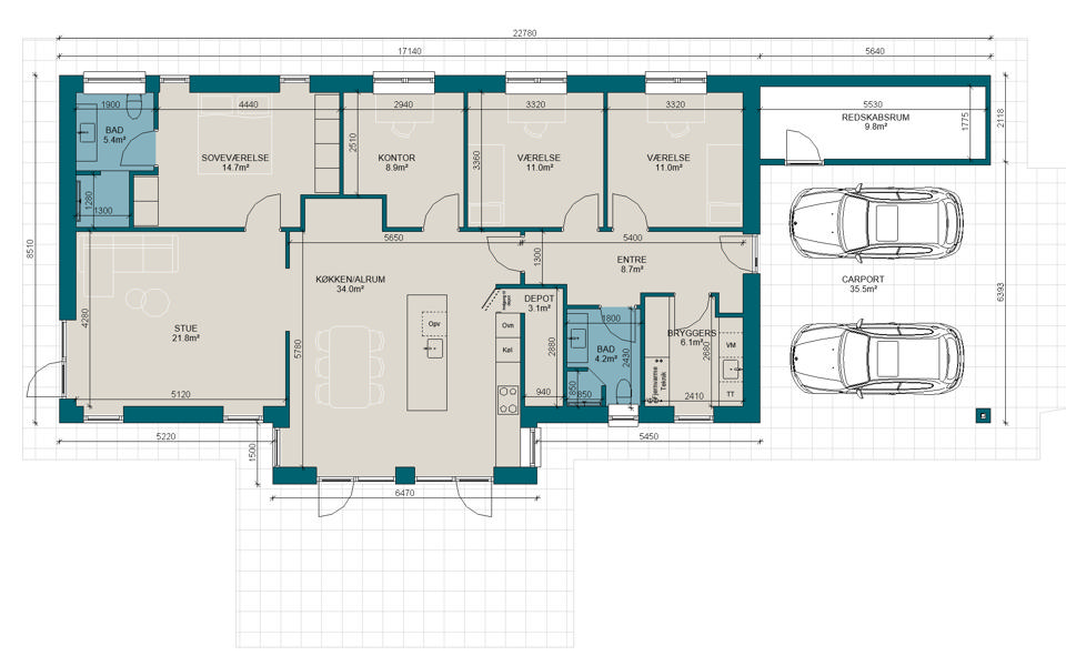 Prisen vokser med antallet af kvadratmeter, men kvadratmeterprisen kan variere alt efter valg af materialer og arkitektur. Tænk over, hvad du har brug for nu – og i fremtiden. Vi skal nok hjælpe dig med at få det maksimale ud af pladsen – nogle gange kræver store idéer færre kvadratmeter, end man skulle tro.
