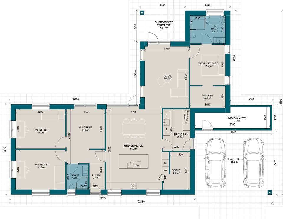 Prisen vokser med antallet af kvadratmeter, men kvadratmeterprisen kan variere alt efter valg af materialer og arkitektur. Tænk over, hvad du har brug for nu – og i fremtiden. Vi skal nok hjælpe dig med at få det maksimale ud af pladsen – nogle gange kræver store idéer færre kvadratmeter, end man skulle tro.