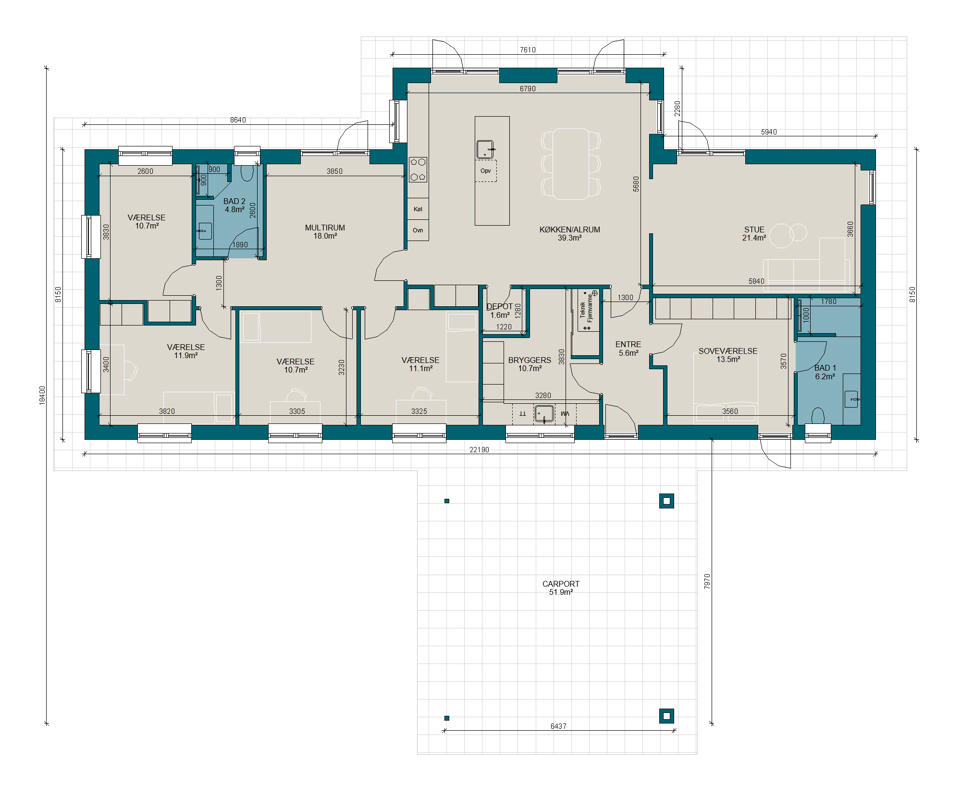 Prisen vokser med antallet af kvadratmeter, men kvadratmeterprisen kan variere alt efter valg af materialer og arkitektur. Tænk over, hvad du har brug for nu – og i fremtiden. Vi skal nok hjælpe dig med at få det maksimale ud af pladsen – nogle gange kræver store idéer færre kvadratmeter, end man skulle tro.