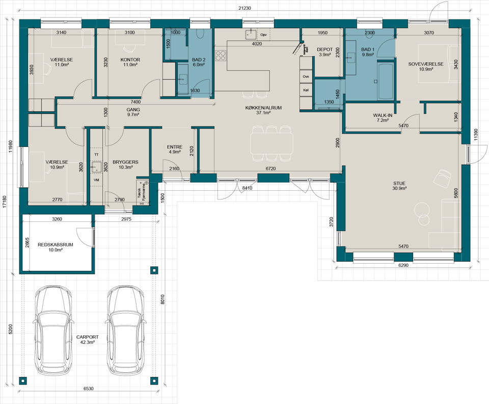 Prisen vokser med antallet af kvadratmeter, men kvadratmeterprisen kan variere alt efter valg af materialer og arkitektur. Tænk over, hvad du har brug for nu – og i fremtiden. Vi skal nok hjælpe dig med at få det maksimale ud af pladsen – nogle gange kræver store idéer færre kvadratmeter, end man skulle tro.