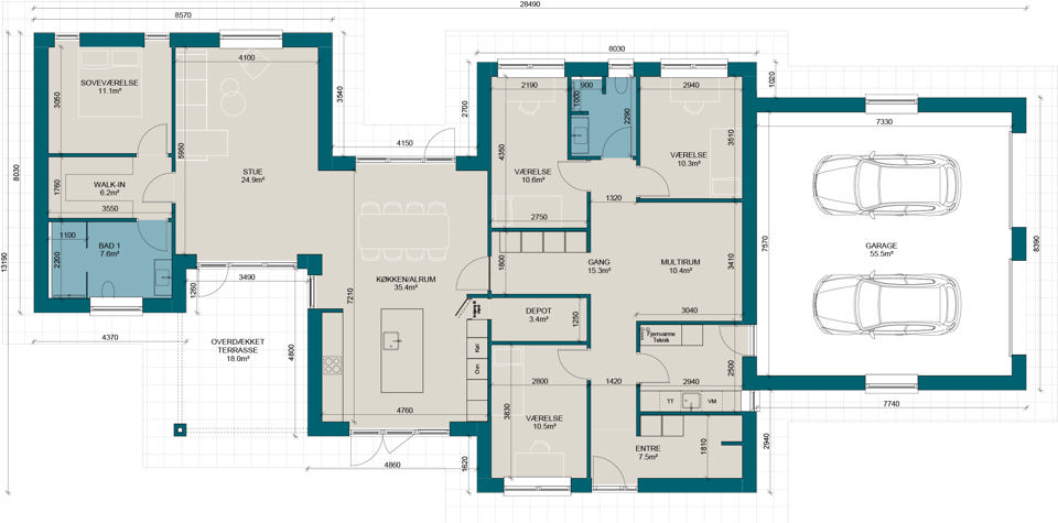 Prisen vokser med antallet af kvadratmeter, men kvadratmeterprisen kan variere alt efter valg af materialer og arkitektur. Tænk over, hvad du har brug for nu – og i fremtiden. Vi skal nok hjælpe dig med at få det maksimale ud af pladsen – nogle gange kræver store idéer færre kvadratmeter, end man skulle tro.