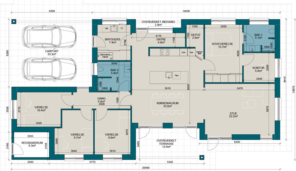 Prisen vokser med antallet af kvadratmeter, men kvadratmeterprisen kan variere alt efter valg af materialer og arkitektur. Tænk over, hvad du har brug for nu – og i fremtiden. Vi skal nok hjælpe dig med at få det maksimale ud af pladsen – nogle gange kræver store idéer færre kvadratmeter, end man skulle tro.