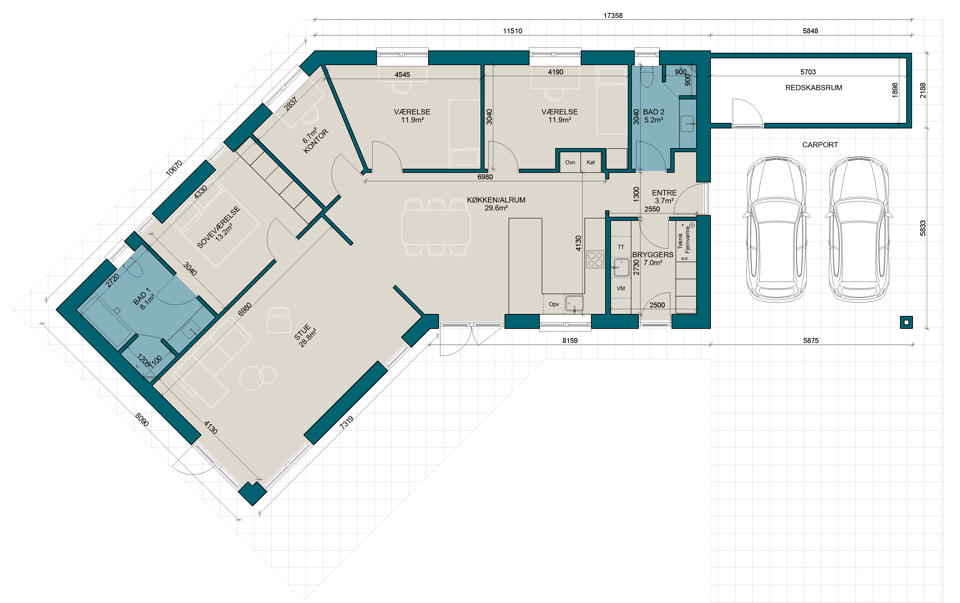 Prisen vokser med antallet af kvadratmeter, men kvadratmeterprisen kan variere alt efter valg af materialer og arkitektur. Tænk over, hvad du har brug for nu – og i fremtiden. Vi skal nok hjælpe dig med at få det maksimale ud af pladsen – nogle gange kræver store idéer færre kvadratmeter, end man skulle tro.