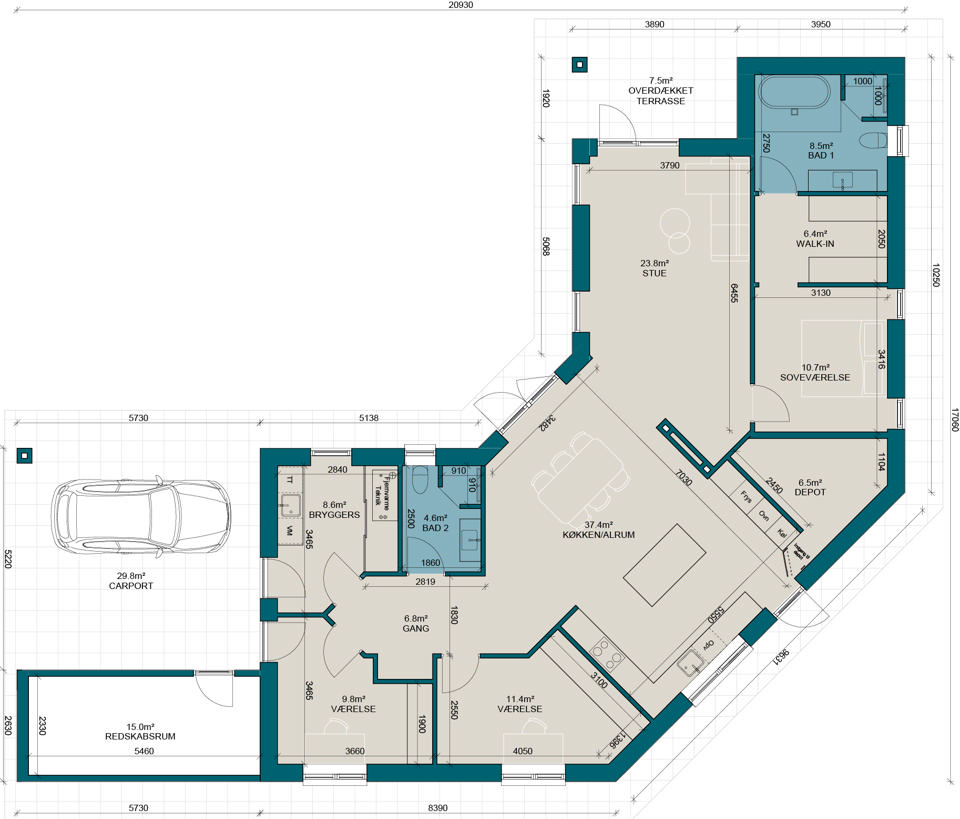 Prisen vokser med antallet af kvadratmeter, men kvadratmeterprisen kan variere alt efter valg af materialer og arkitektur. Tænk over, hvad du har brug for nu – og i fremtiden. Vi skal nok hjælpe dig med at få det maksimale ud af pladsen – nogle gange kræver store idéer færre kvadratmeter, end man skulle tro.