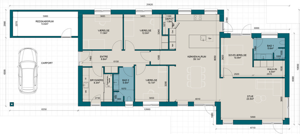 Prisen vokser med antallet af kvadratmeter, men kvadratmeterprisen kan variere alt efter valg af materialer og arkitektur. Tænk over, hvad du har brug for nu – og i fremtiden. Vi skal nok hjælpe dig med at få det maksimale ud af pladsen – nogle gange kræver store idéer færre kvadratmeter, end man skulle tro.