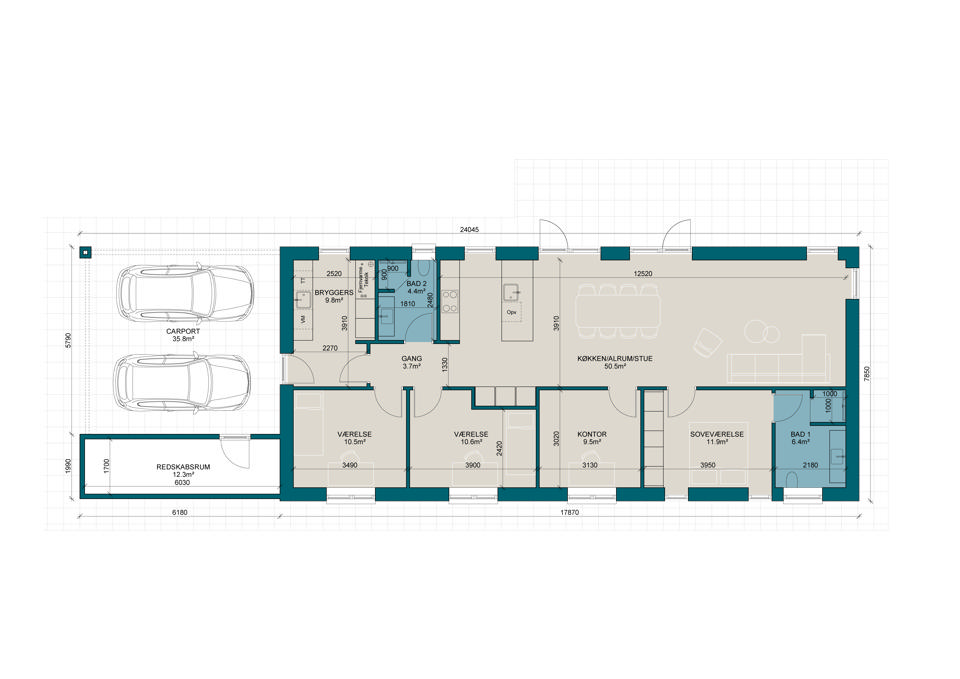 Prisen vokser med antallet af kvadratmeter, men kvadratmeterprisen kan variere alt efter valg af materialer og arkitektur. Tænk over, hvad du har brug for nu – og i fremtiden. Vi skal nok hjælpe dig med at få det maksimale ud af pladsen – nogle gange kræver store idéer færre kvadratmeter, end man skulle tro.