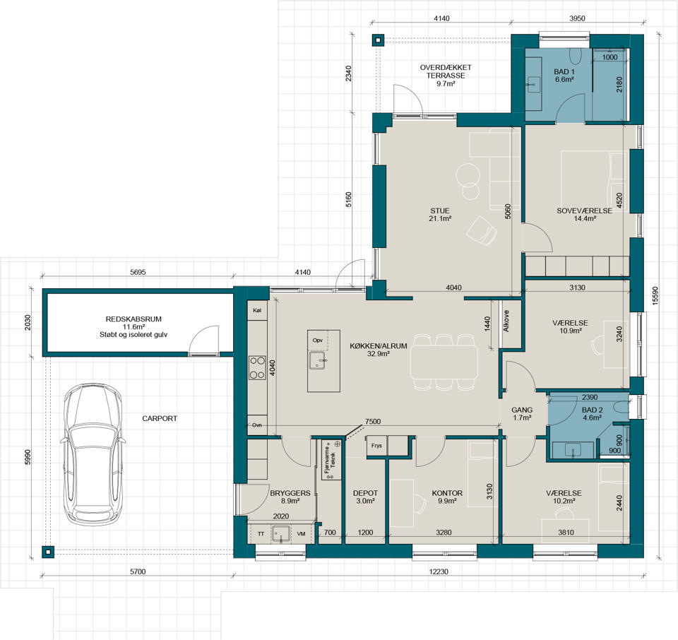 Prisen vokser med antallet af kvadratmeter, men kvadratmeterprisen kan variere alt efter valg af materialer og arkitektur. Tænk over, hvad du har brug for nu – og i fremtiden. Vi skal nok hjælpe dig med at få det maksimale ud af pladsen – nogle gange kræver store idéer færre kvadratmeter, end man skulle tro.