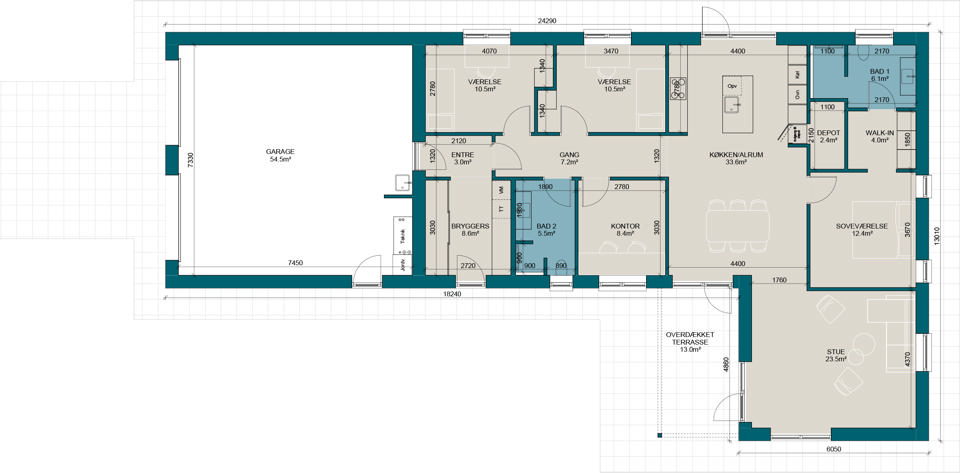 Prisen vokser med antallet af kvadratmeter, men kvadratmeterprisen kan variere alt efter valg af materialer og arkitektur. Tænk over, hvad du har brug for nu – og i fremtiden. Vi skal nok hjælpe dig med at få det maksimale ud af pladsen – nogle gange kræver store idéer færre kvadratmeter, end man skulle tro.