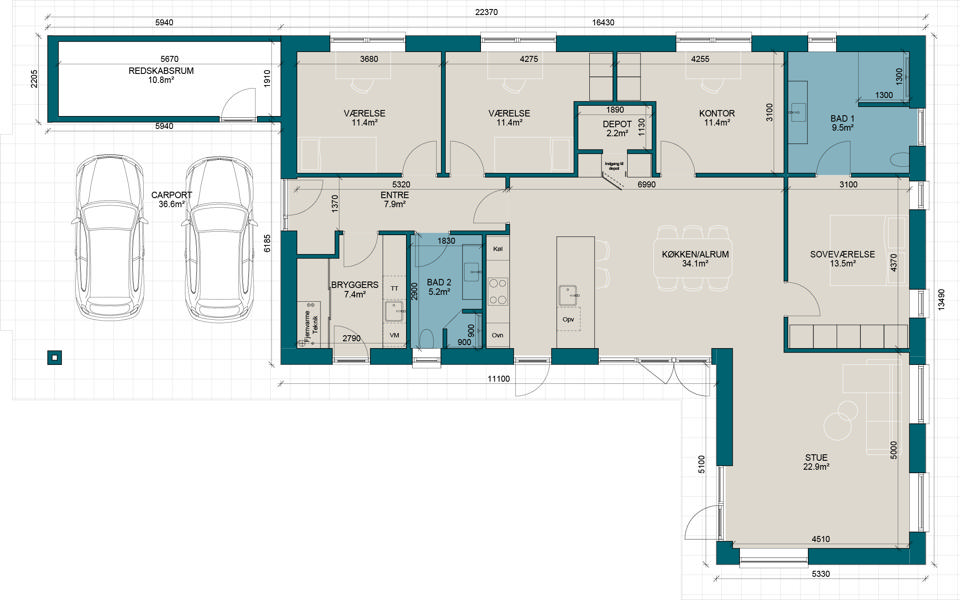 Prisen vokser med antallet af kvadratmeter, men kvadratmeterprisen kan variere alt efter valg af materialer og arkitektur. Tænk over, hvad du har brug for nu – og i fremtiden. Vi skal nok hjælpe dig med at få det maksimale ud af pladsen – nogle gange kræver store idéer færre kvadratmeter, end man skulle tro.