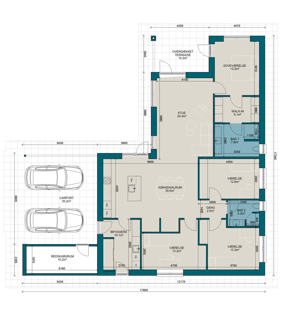 Prisen vokser med antallet af kvadratmeter, men kvadratmeterprisen kan variere alt efter valg af materialer og arkitektur. Tænk over, hvad du har brug for nu – og i fremtiden. Vi skal nok hjælpe dig med at få det maksimale ud af pladsen – nogle gange kræver store idéer færre kvadratmeter, end man skulle tro.