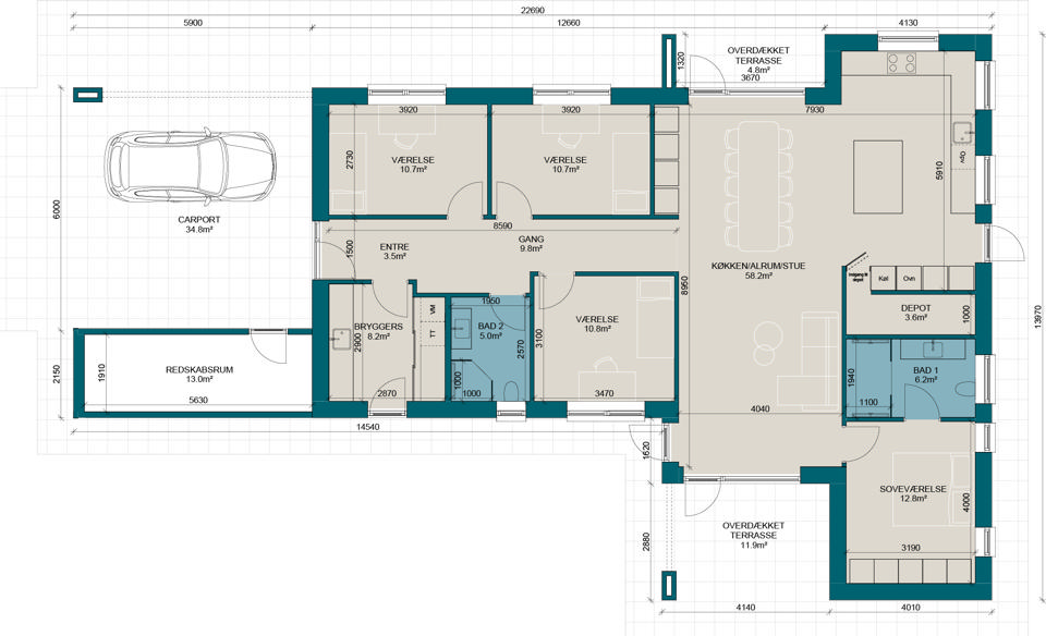 Prisen vokser med antallet af kvadratmeter, men kvadratmeterprisen kan variere alt efter valg af materialer og arkitektur. Tænk over, hvad du har brug for nu – og i fremtiden. Vi skal nok hjælpe dig med at få det maksimale ud af pladsen – nogle gange kræver store idéer færre kvadratmeter, end man skulle tro.