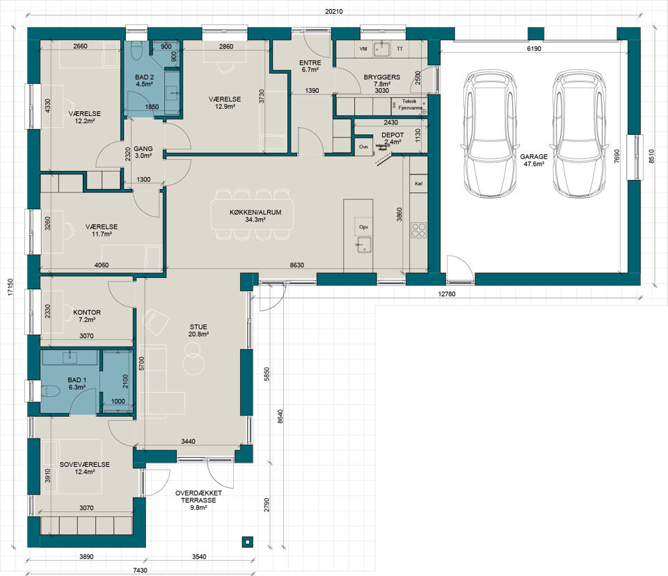 Prisen vokser med antallet af kvadratmeter, men kvadratmeterprisen kan variere alt efter valg af materialer og arkitektur. Tænk over, hvad du har brug for nu – og i fremtiden. Vi skal nok hjælpe dig med at få det maksimale ud af pladsen – nogle gange kræver store idéer færre kvadratmeter, end man skulle tro.
