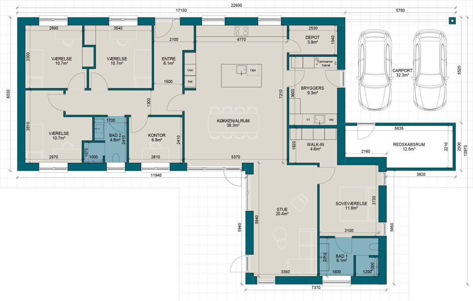 Prisen vokser med antallet af kvadratmeter, men kvadratmeterprisen kan variere alt efter valg af materialer og arkitektur. Tænk over, hvad du har brug for nu – og i fremtiden. Vi skal nok hjælpe dig med at få det maksimale ud af pladsen – nogle gange kræver store idéer færre kvadratmeter, end man skulle tro.