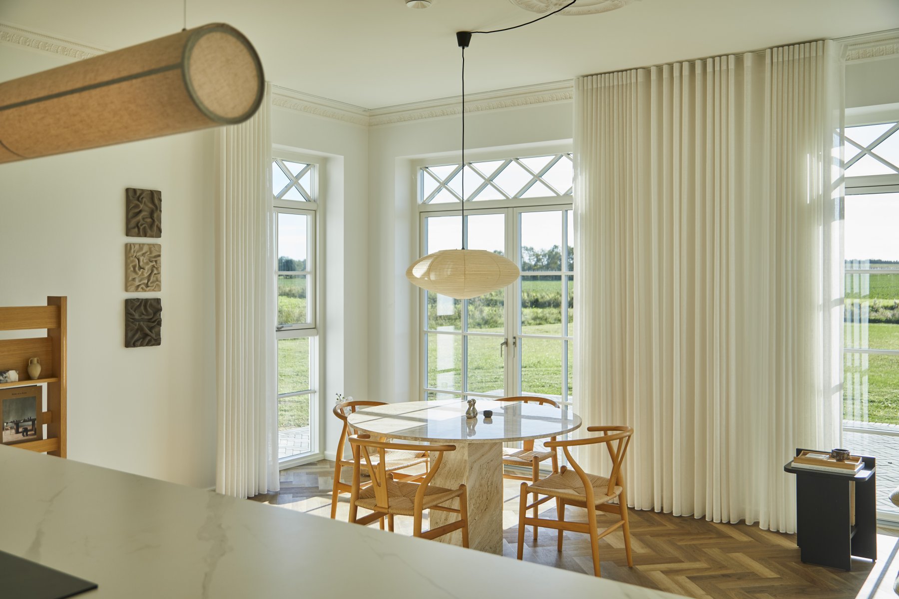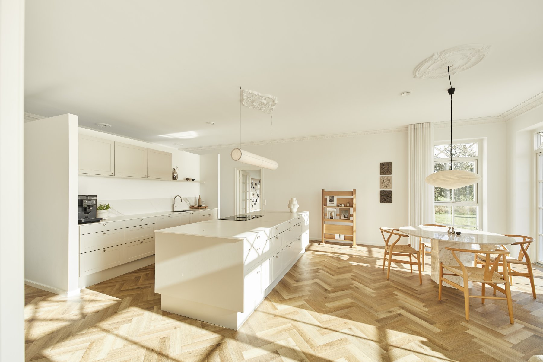 Hævede lofter og vinduespartier med overpartier giver masser af rumlighed og lys.