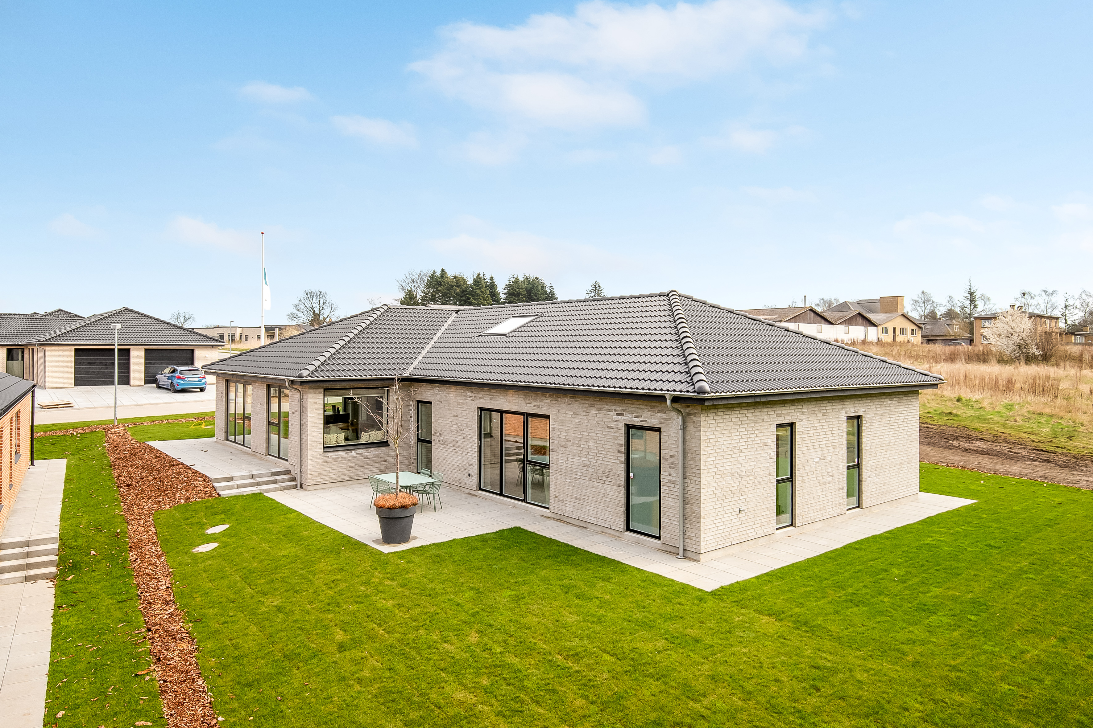 Fra køkken-alrummet træder du to trin ned i en hyggelig stue med et stort ovenlysvindue over sofasektionen. I denne del af boligen er loftshøjden ca. 275 cm, mens alrummet har skrå lofter. Den ekstra loftshøjde får selv mindre værelser til at føles markant større. Ligesom alrummet fungerer stuen fordelingspunkt til værelserne, hvilket minimerer gangarealer til fordel for opholdsplads, du faktisk bruger. Her ligger to gode børneværelser med eget badeværelse samt en forældreafdeling med walk-in og badeværelse med udgang til haven.