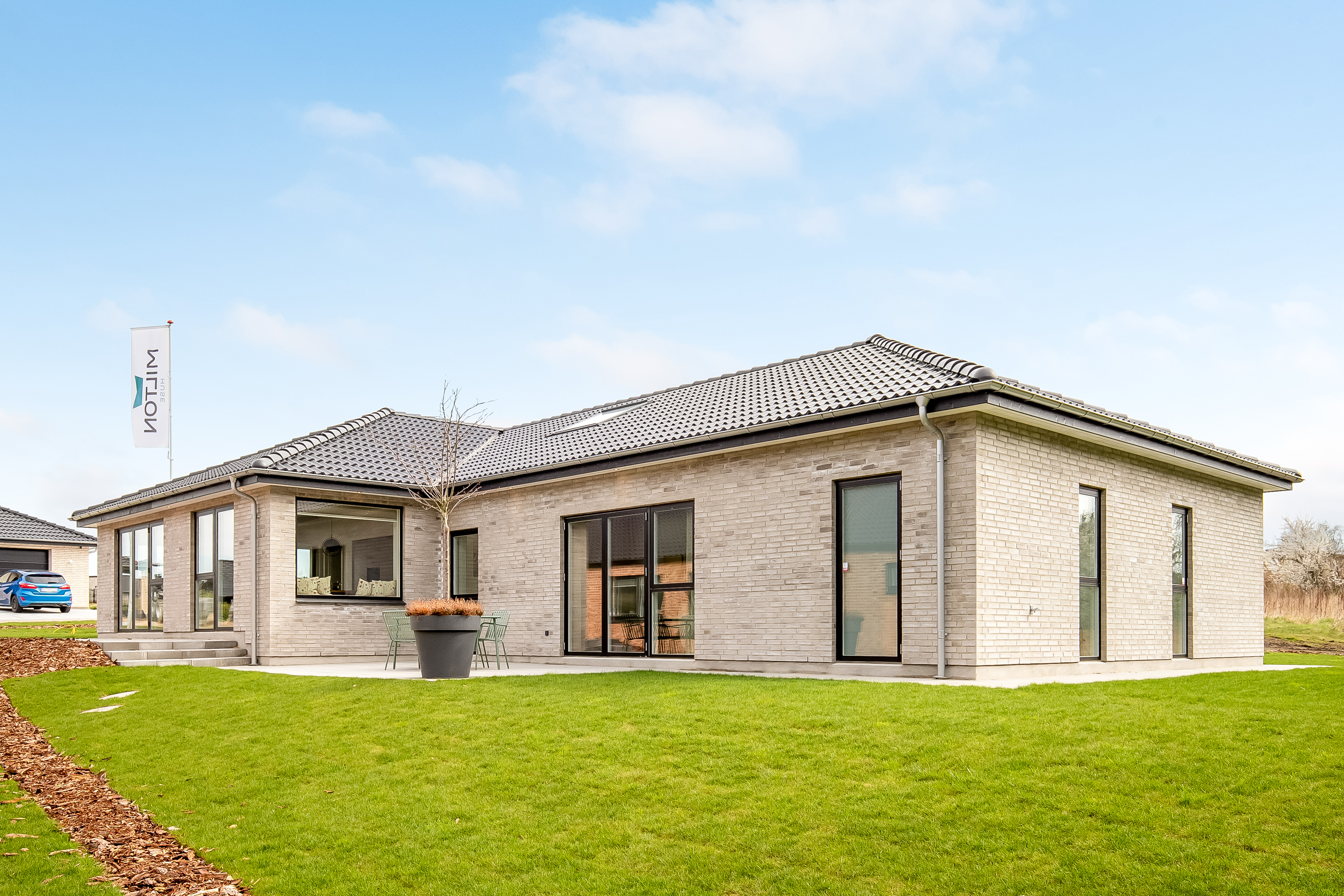 Formmæssigt er der tale om et forskudt vinkelhus med valmtag og udhæng, en integreret carport og et redskabsrum med muret søjle. Facaden er beklædt med Taurus Massiv.