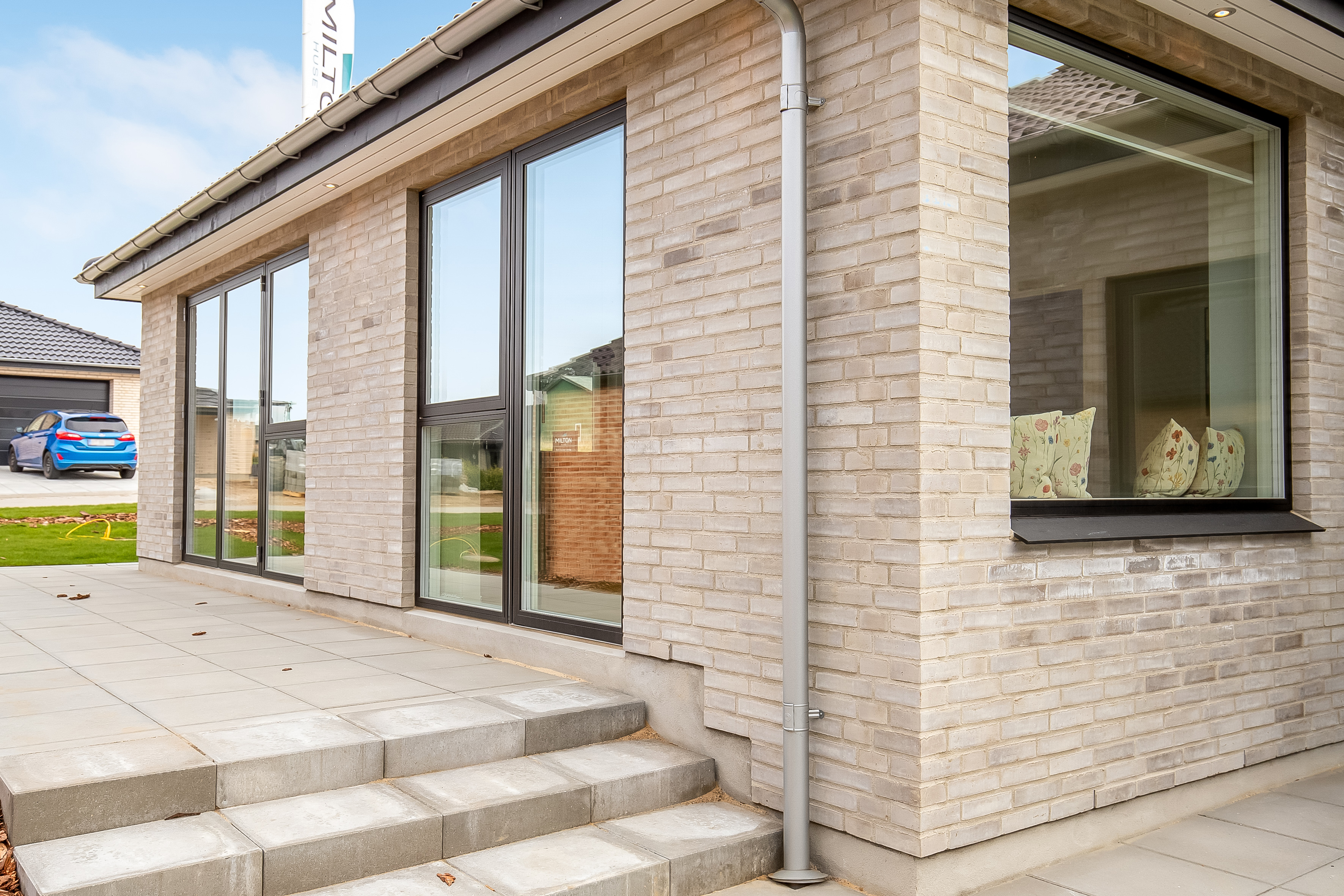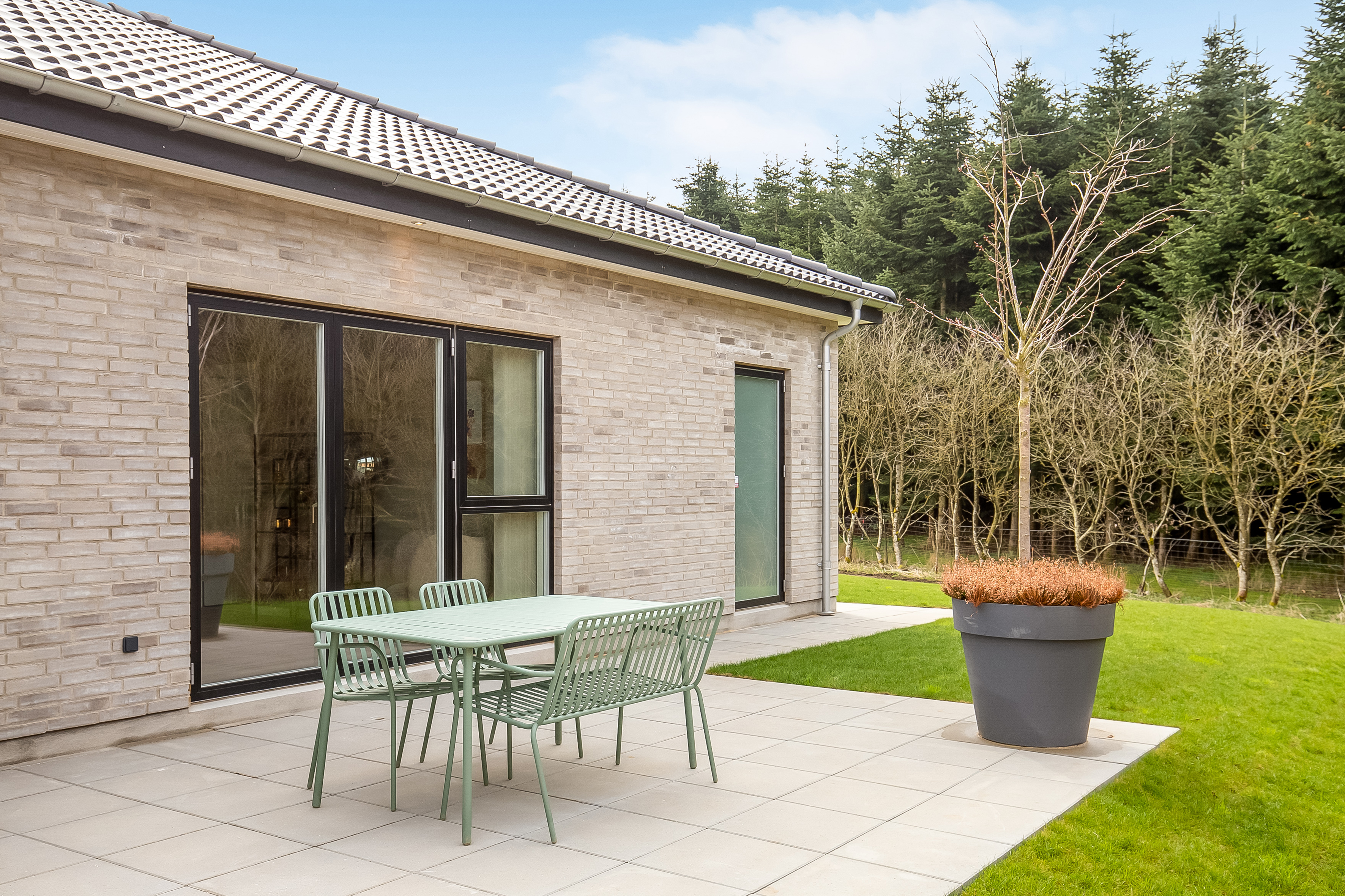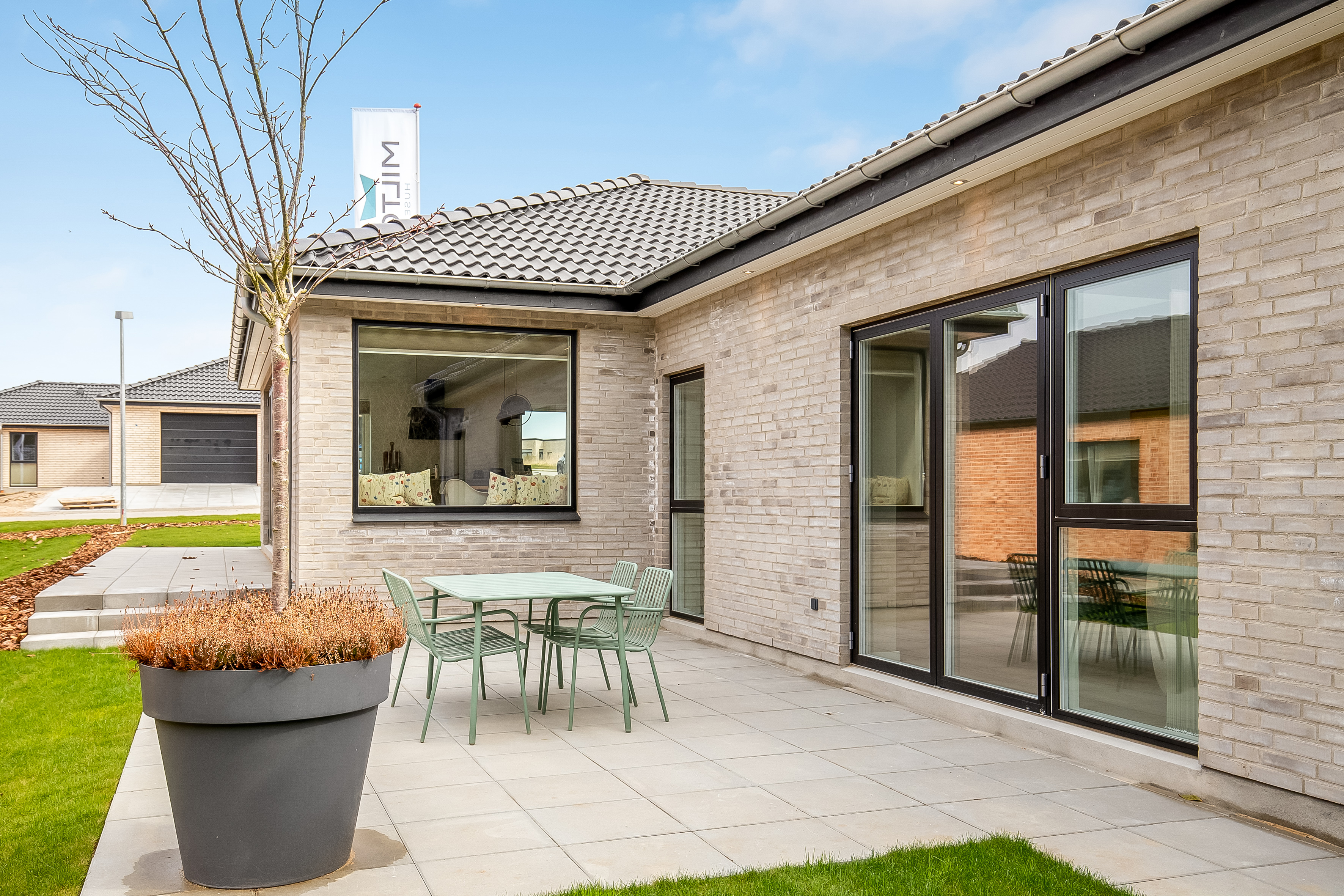 Indenfor er entré og bryggers samlet i én rummelig løsning, så hverdagen bliver nem. Indkøbene ryger hurtigt videre til køkken-alrummet lige inden for døren. Køkkenet er indrettet med fritstående ø og et skjult depotrum integreret i skabsvæggen, så du får masser af opbevaring uden rod. Herfra er der også adgang til et kontor – perfekt til hjemmearbejde med kaffemaskinen tæt på. Har du brug for en slapper kan du tage plads ved sansevinduet i hjørnet af alrummet, hvor du fra den indbyggede bænk kan sidde og betragte livet i både huset og haven.