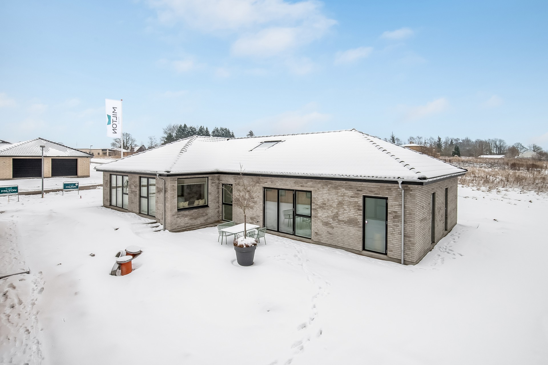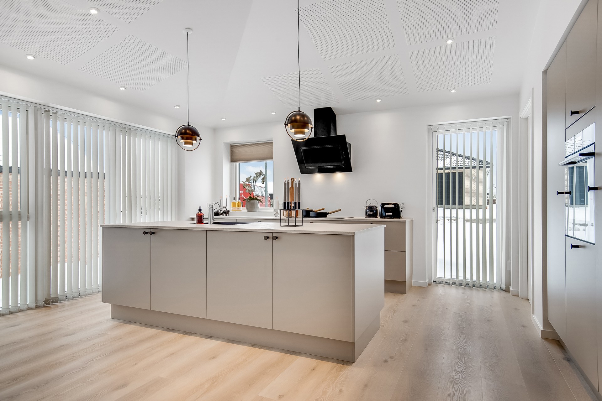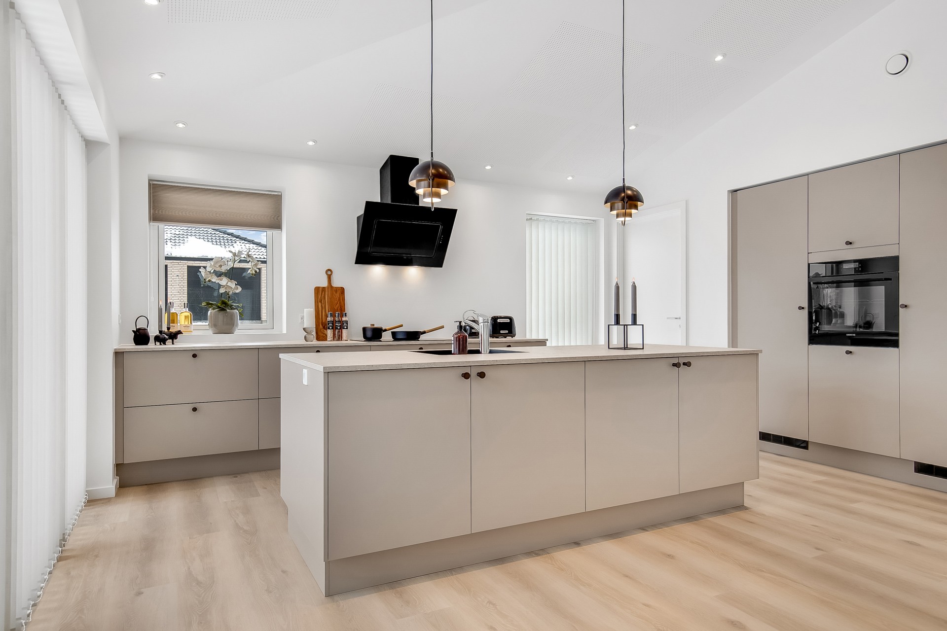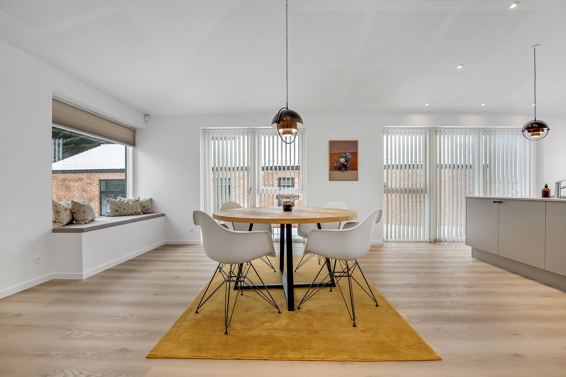 Indenfor er entré og bryggers samlet i én rummelig løsning, så hverdagen bliver nem. Indkøbene ryger hurtigt videre til køkken-alrummet lige inden for døren. Køkkenet er indrettet med fritstående ø og et skjult depotrum integreret i skabsvæggen, så du får masser af opbevaring uden rod. Herfra er der også adgang til et kontor – perfekt til hjemmearbejde med kaffemaskinen tæt på. Har du brug for en slapper kan du tage plads ved sansevinduet i hjørnet af alrummet, hvor du fra den indbyggede bænk kan sidde og betragte livet i både huset og haven.