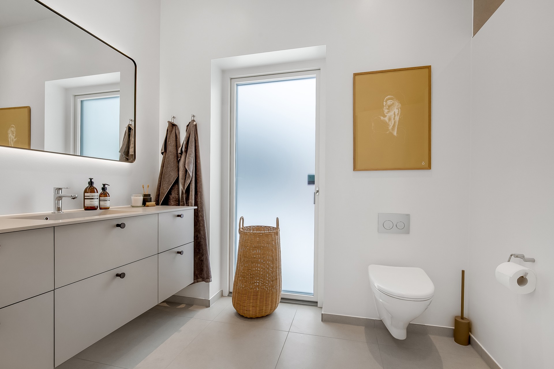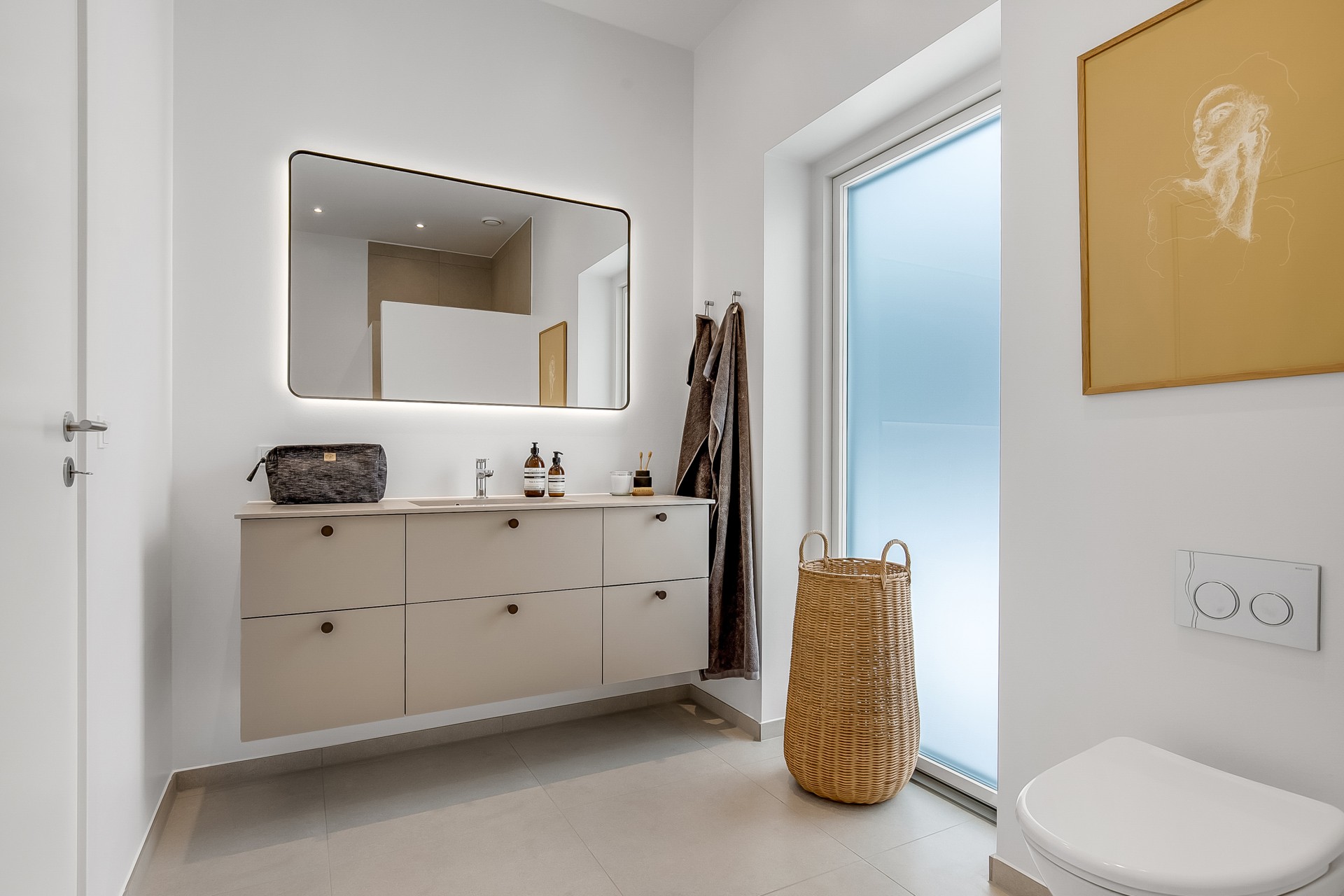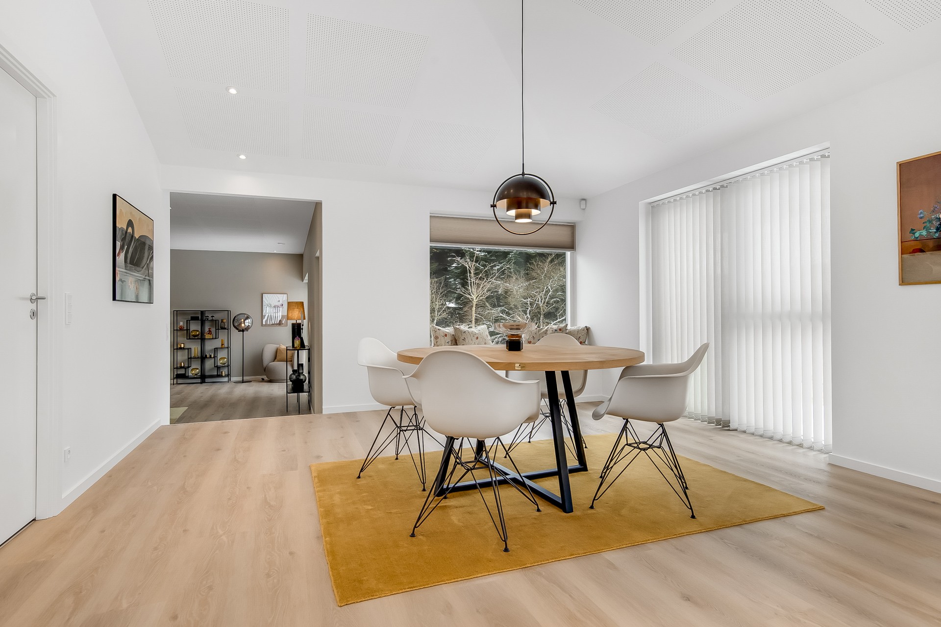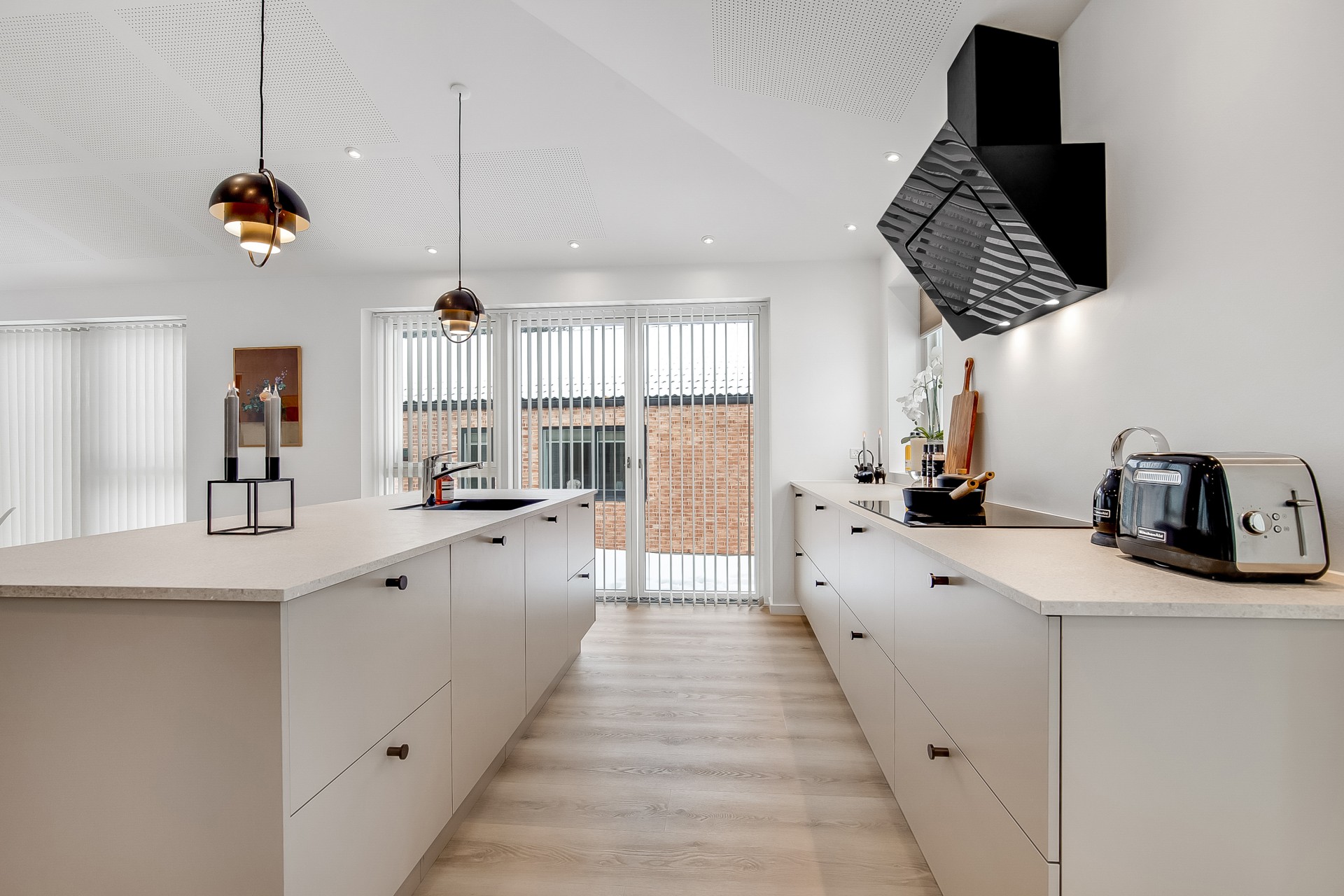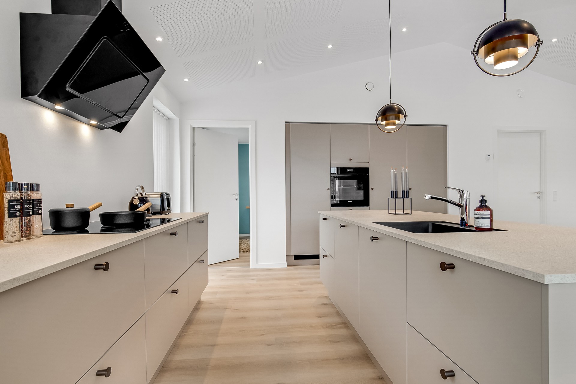 Indenfor er entré og bryggers samlet i én rummelig løsning, så hverdagen bliver nem. Indkøbene ryger hurtigt videre til køkken-alrummet lige inden for døren. Køkkenet er indrettet med fritstående ø og et skjult depotrum integreret i skabsvæggen, så du får masser af opbevaring uden rod. Herfra er der også adgang til et kontor – perfekt til hjemmearbejde med kaffemaskinen tæt på. Har du brug for en slapper kan du tage plads ved sansevinduet i hjørnet af alrummet, hvor du fra den indbyggede bænk kan sidde og betragte livet i både huset og haven.