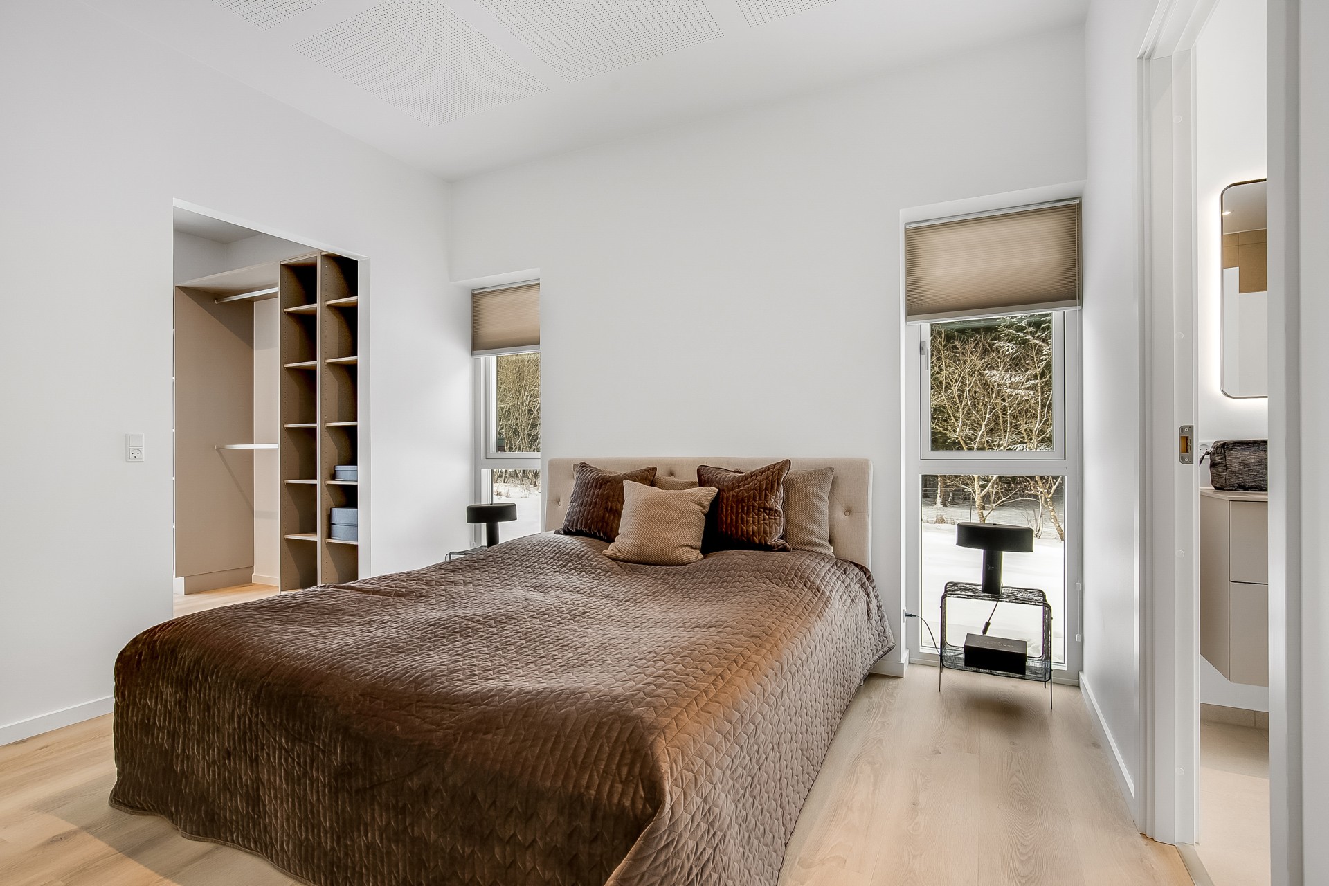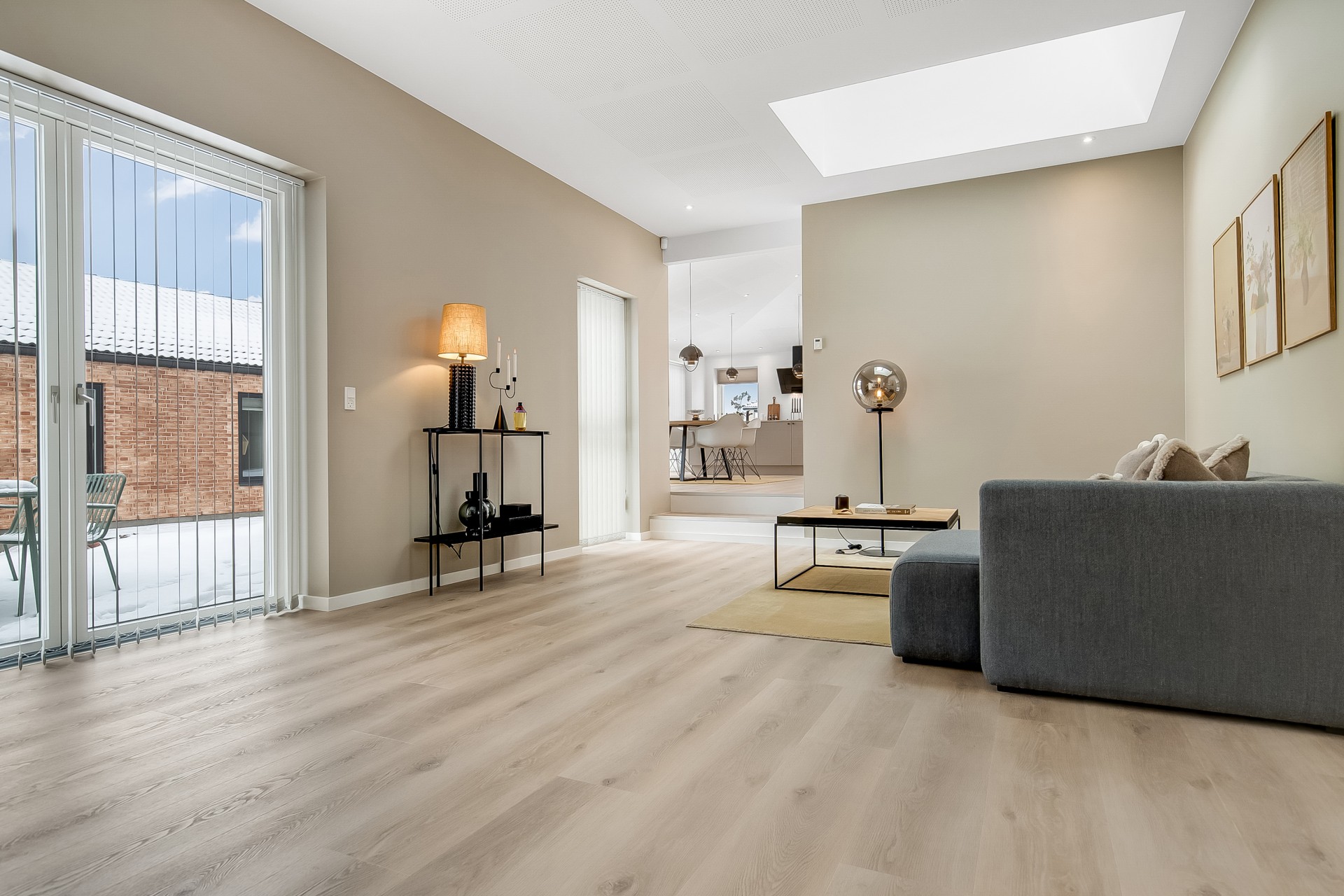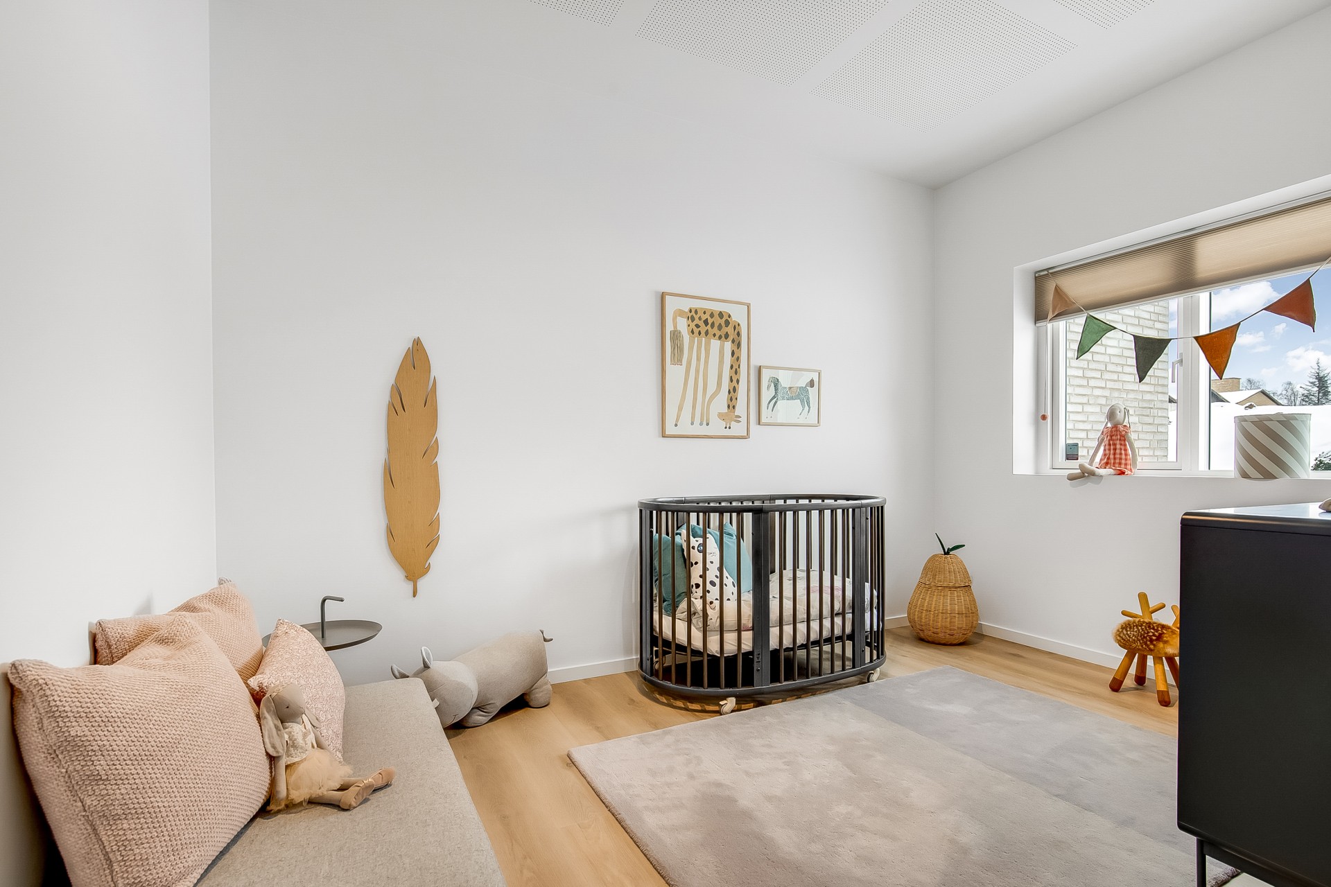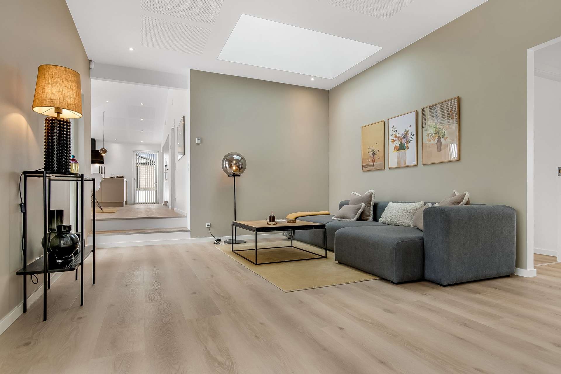 Fra køkken-alrummet træder du to trin ned i en hyggelig stue med et stort ovenlysvindue over sofasektionen. I denne del af boligen er loftshøjden ca. 275 cm, mens alrummet har skrå lofter. Den ekstra loftshøjde får selv mindre værelser til at føles markant større. Ligesom alrummet fungerer stuen fordelingspunkt til værelserne, hvilket minimerer gangarealer til fordel for opholdsplads, du faktisk bruger. Her ligger to gode børneværelser med eget badeværelse samt en forældreafdeling med walk-in og badeværelse med udgang til haven.