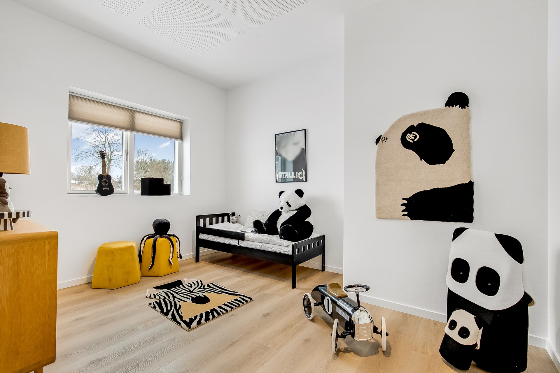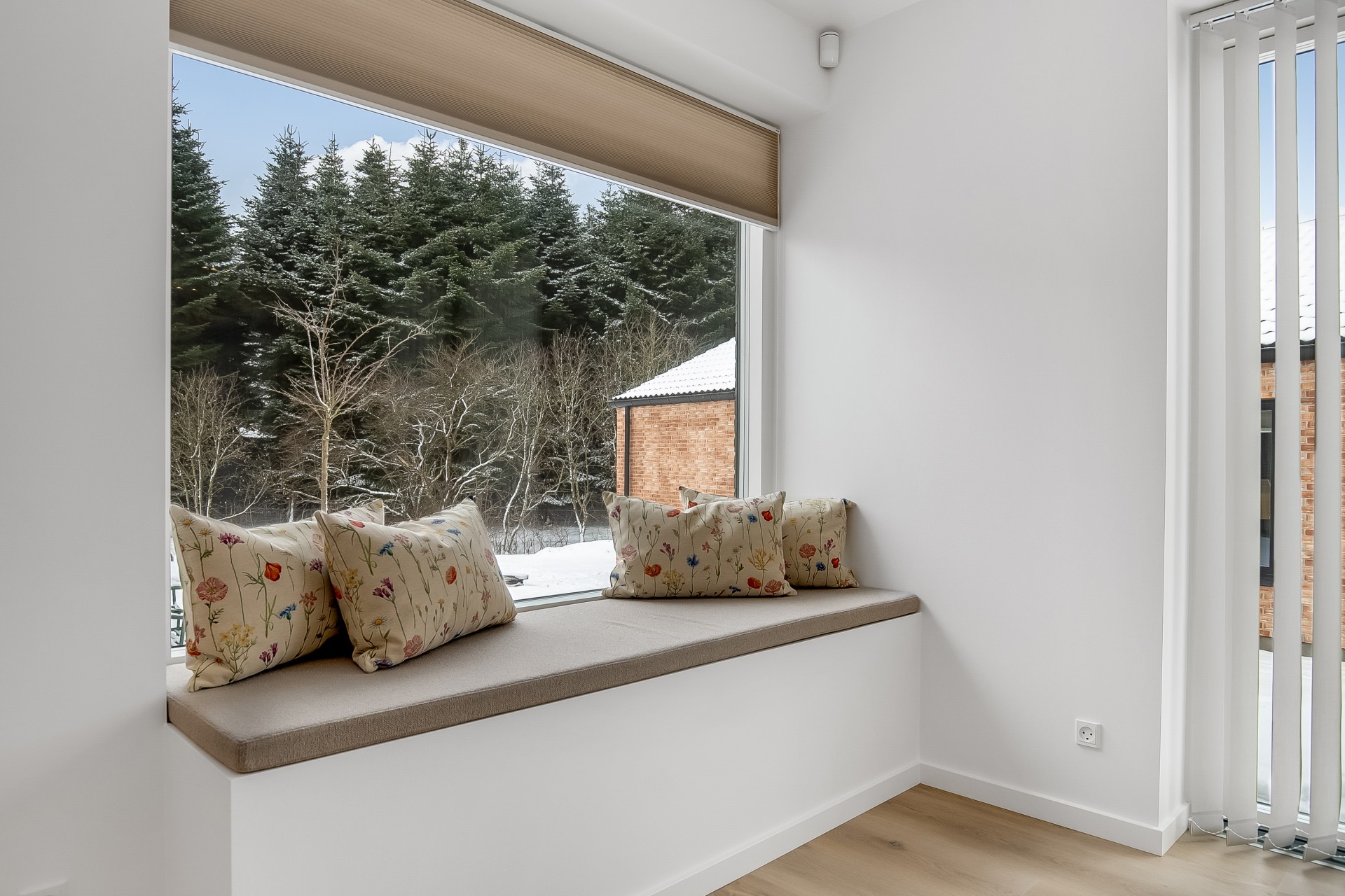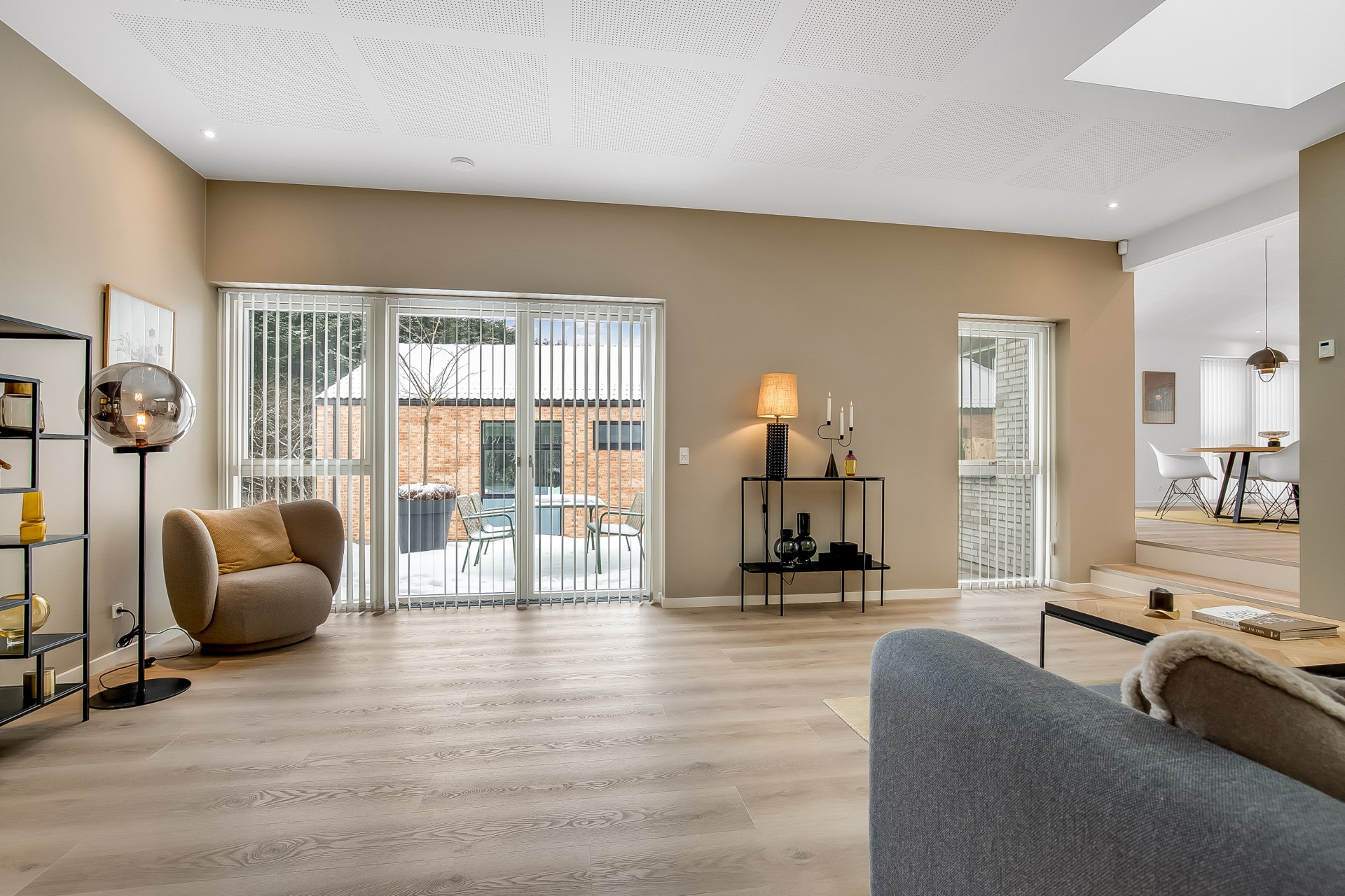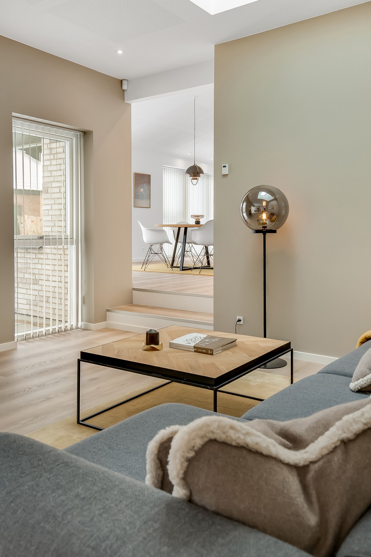 Fra køkken-alrummet træder du to trin ned i en hyggelig stue med et stort ovenlysvindue over sofasektionen. I denne del af boligen er loftshøjden ca. 275 cm, mens alrummet har skrå lofter. Den ekstra loftshøjde får selv mindre værelser til at føles markant større. Ligesom alrummet fungerer stuen fordelingspunkt til værelserne, hvilket minimerer gangarealer til fordel for opholdsplads, du faktisk bruger. Her ligger to gode børneværelser med eget badeværelse samt en forældreafdeling med walk-in og badeværelse med udgang til haven.